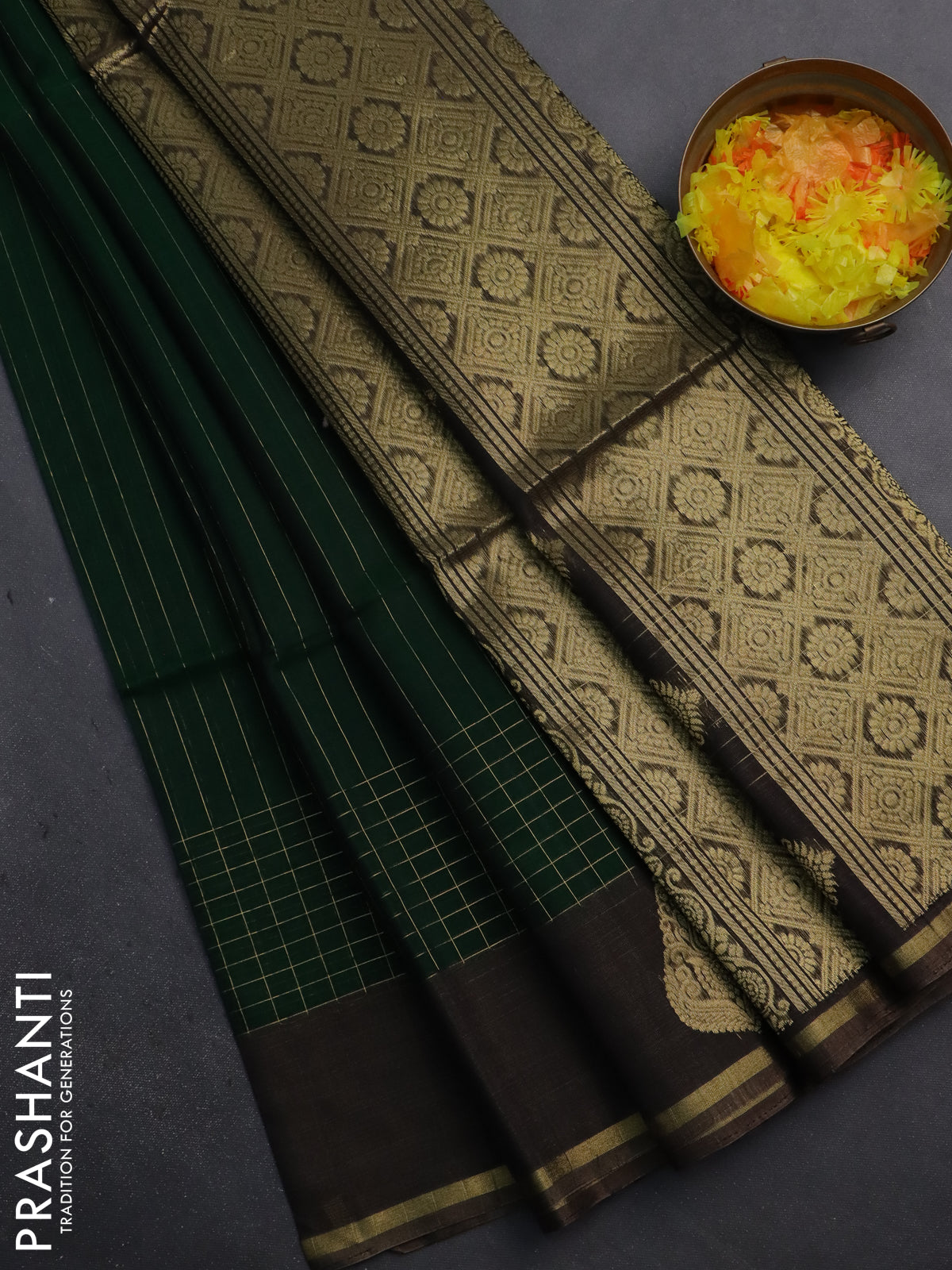 Kora silk cotton saree green and dark grey with allover zari stripes pattern and zari woven piping border