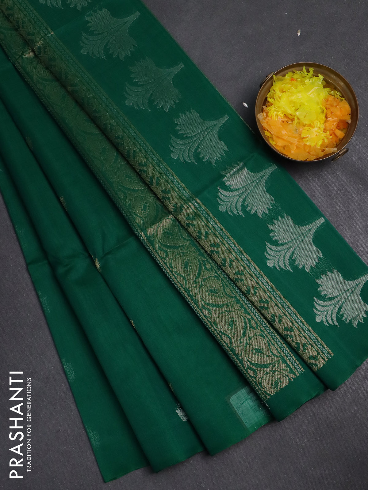 Kora silk cotton saree green with silver & gold zari woven buttas in borderless style