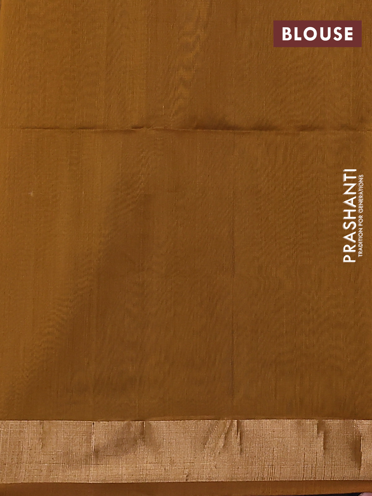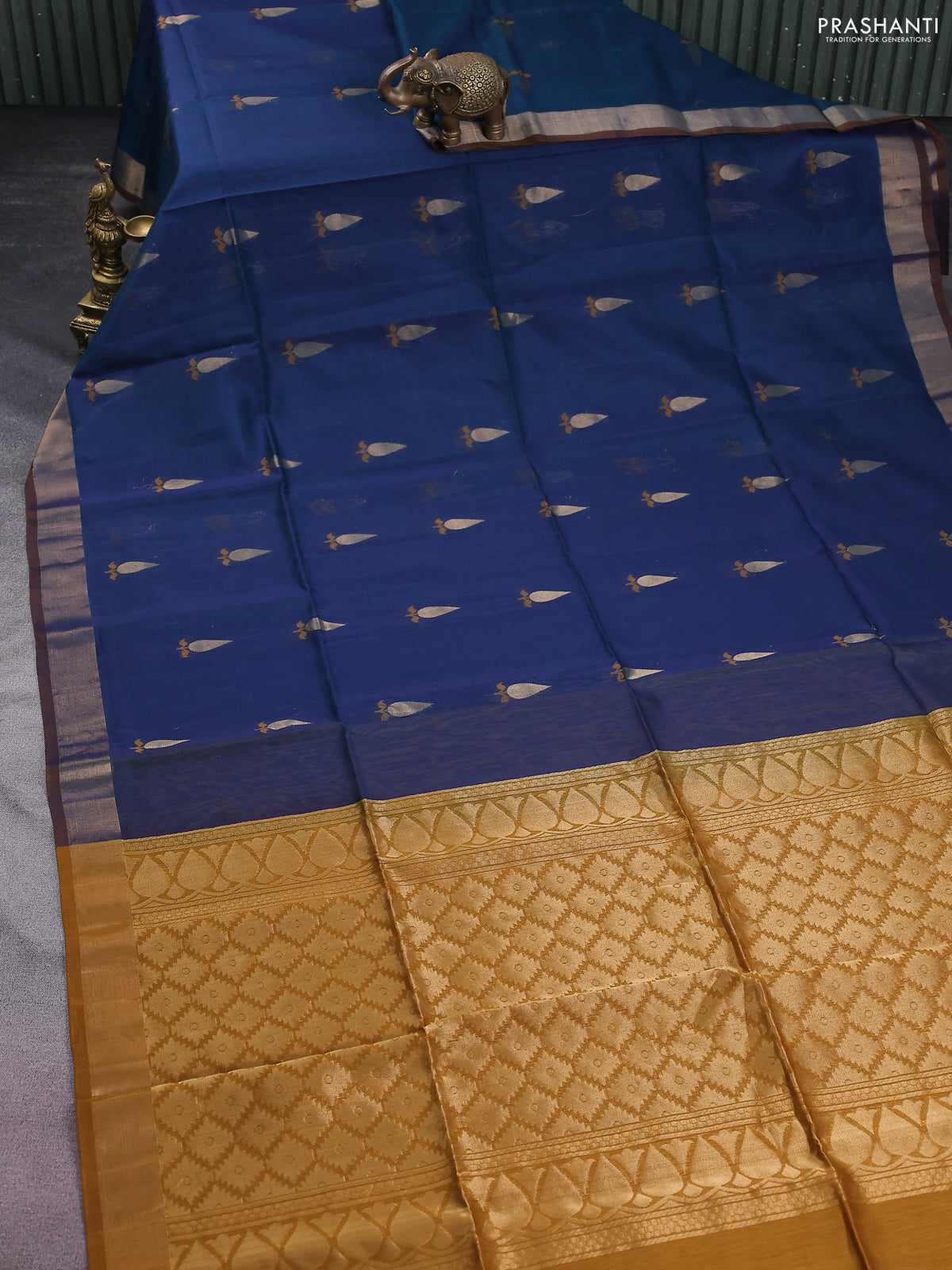Kora silk cotton saree peacock blue and dark mustard with thread & zari woven geometric buttas and zari woven border