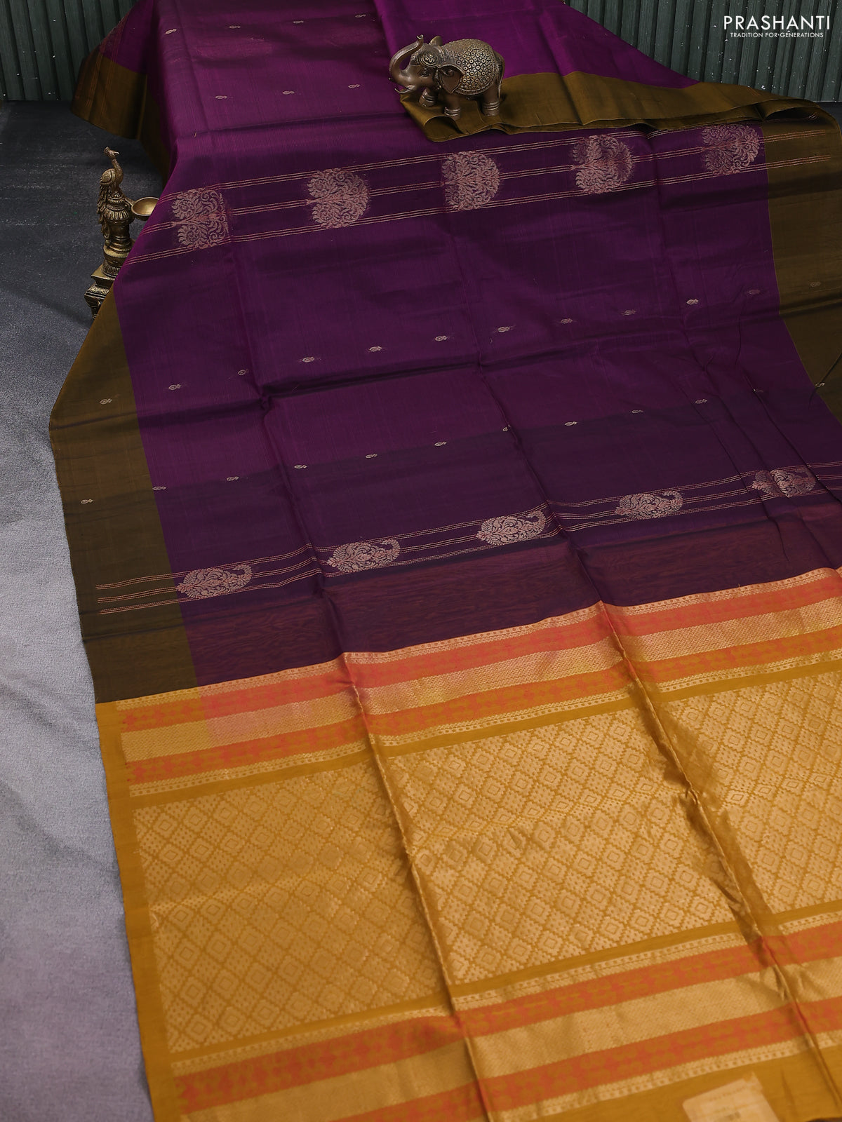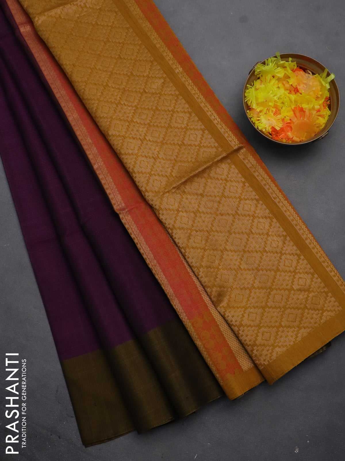 Kora silk cotton saree purple and mustard yellow with allover thread & zari buttas and zari woven butta border