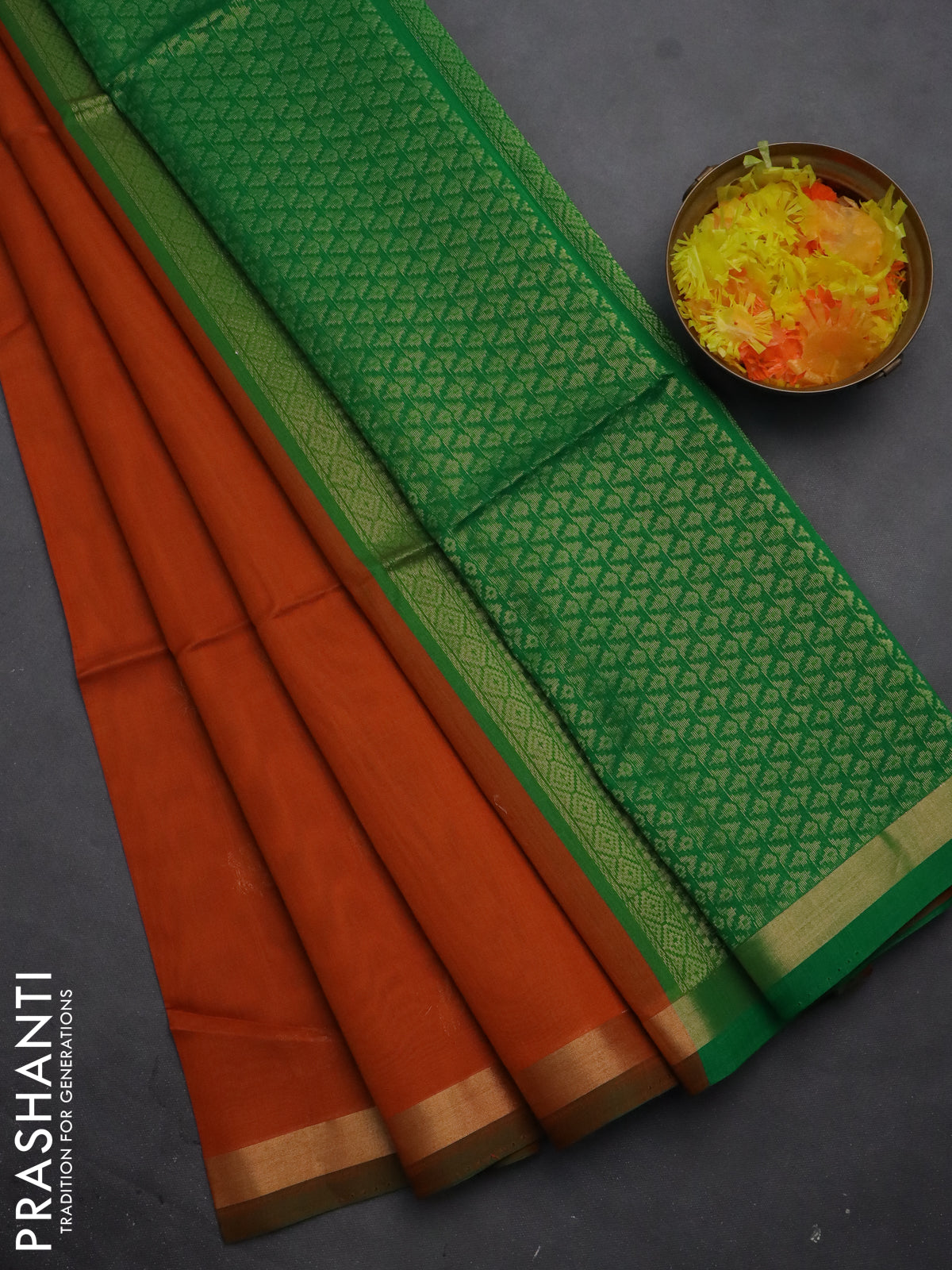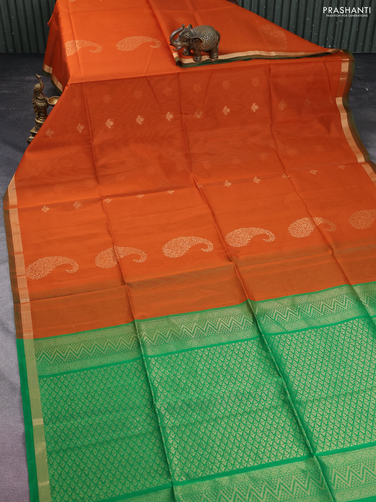 Kora silk cotton saree rustic orange and green with zari woven buttas and zari woven border