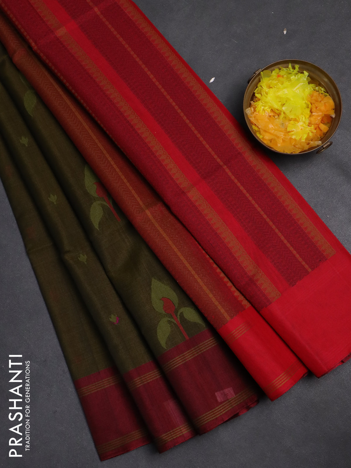 Kora silk cotton saree sap green and red with thread woven buttas and rettapet border