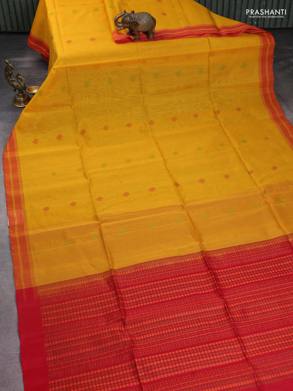 Kora silk cotton saree yellow and red with thread woven geometric buttas and rettapet border