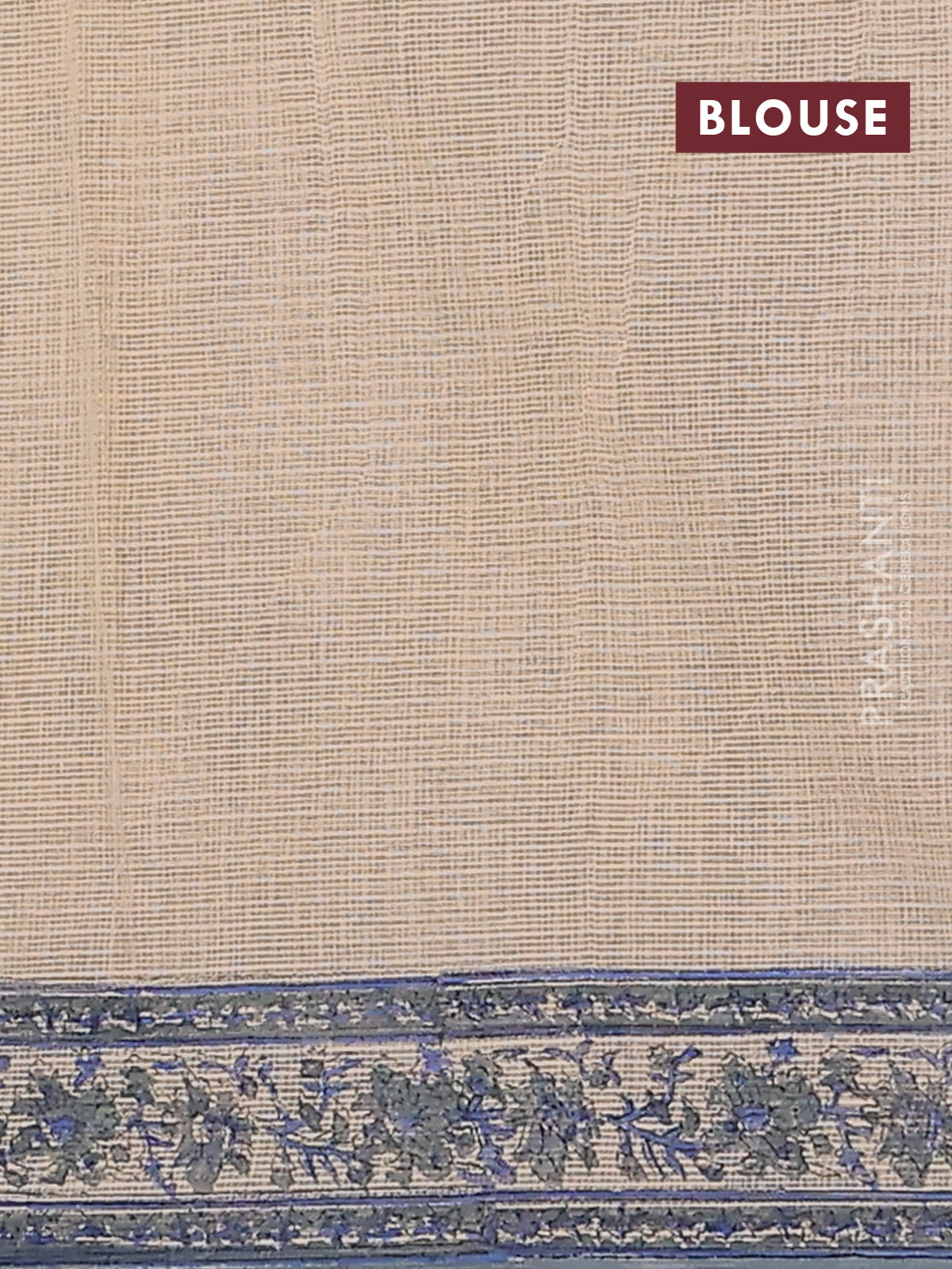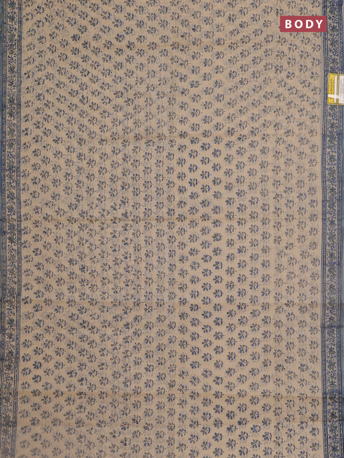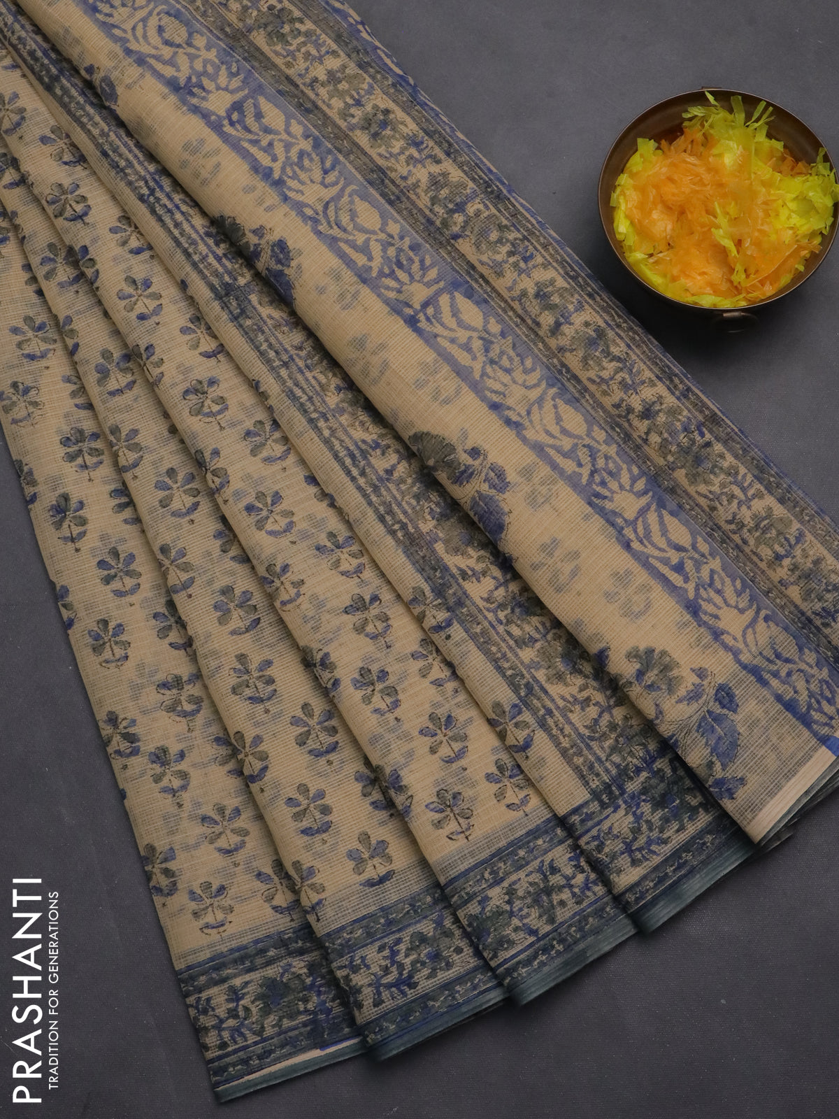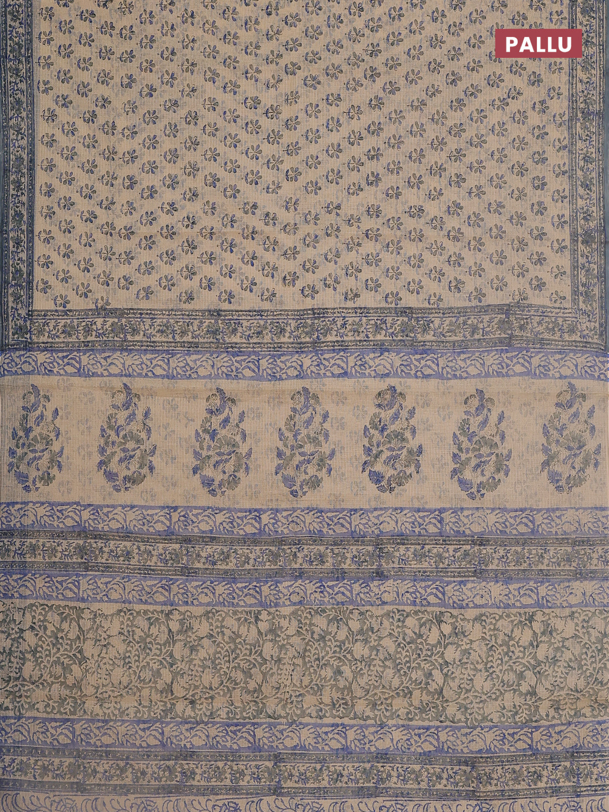 Kota doria saree beige and bluish grey with allover block prints and printed border