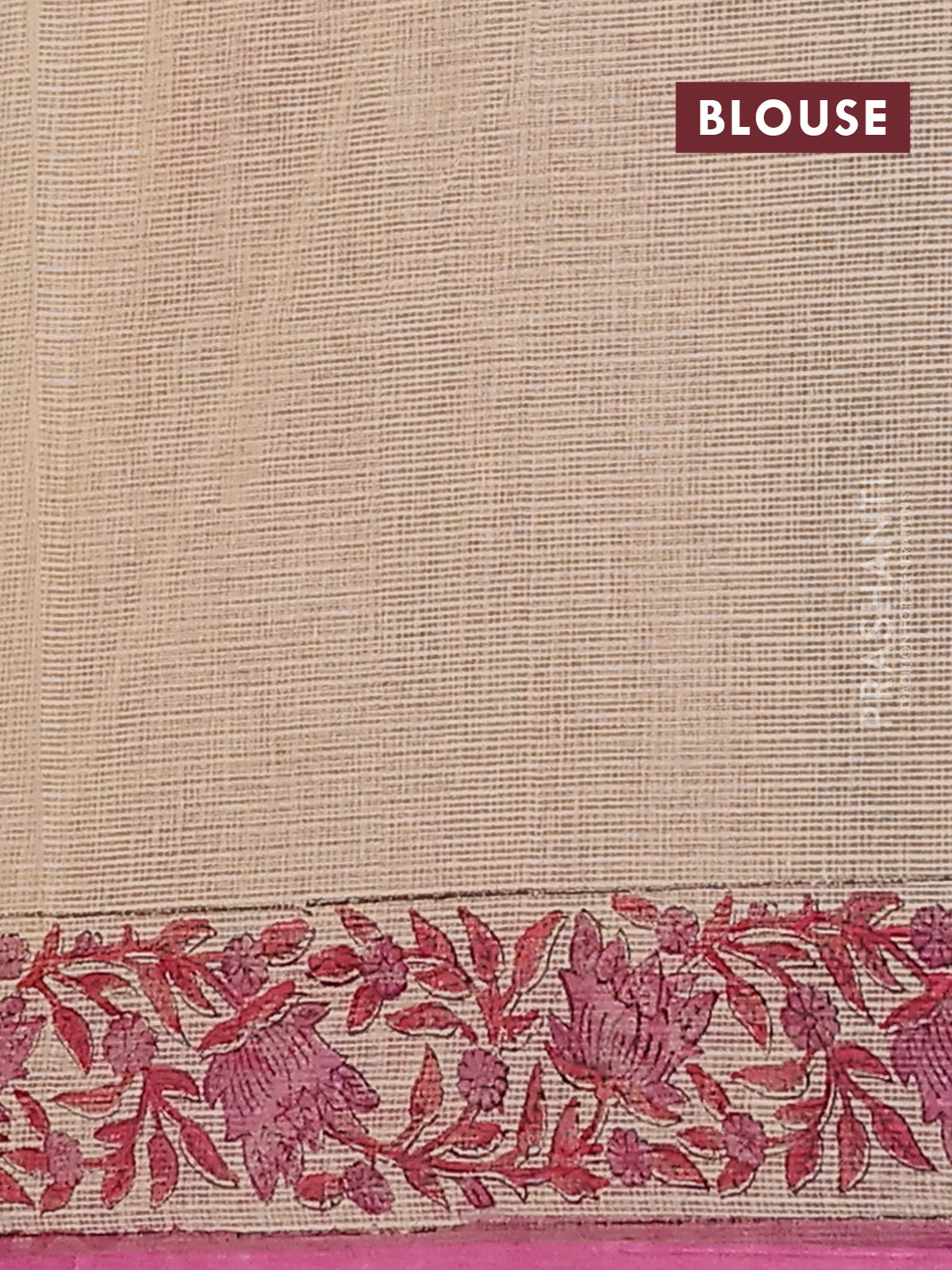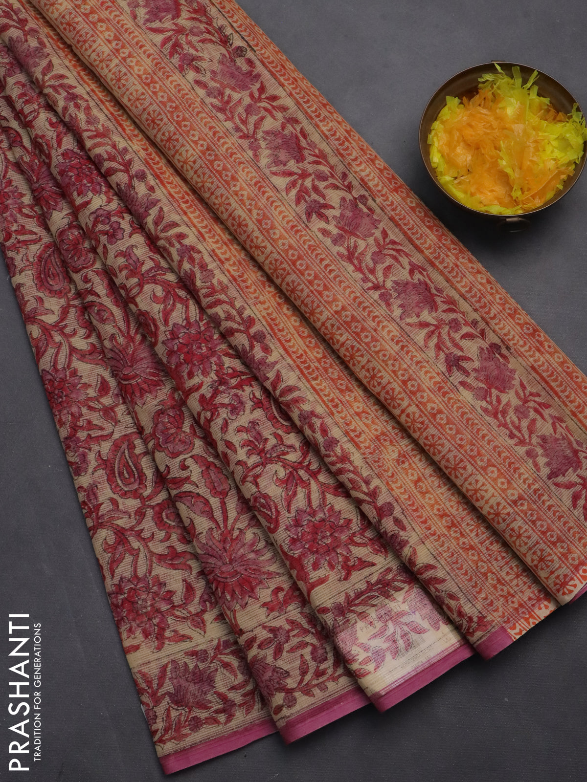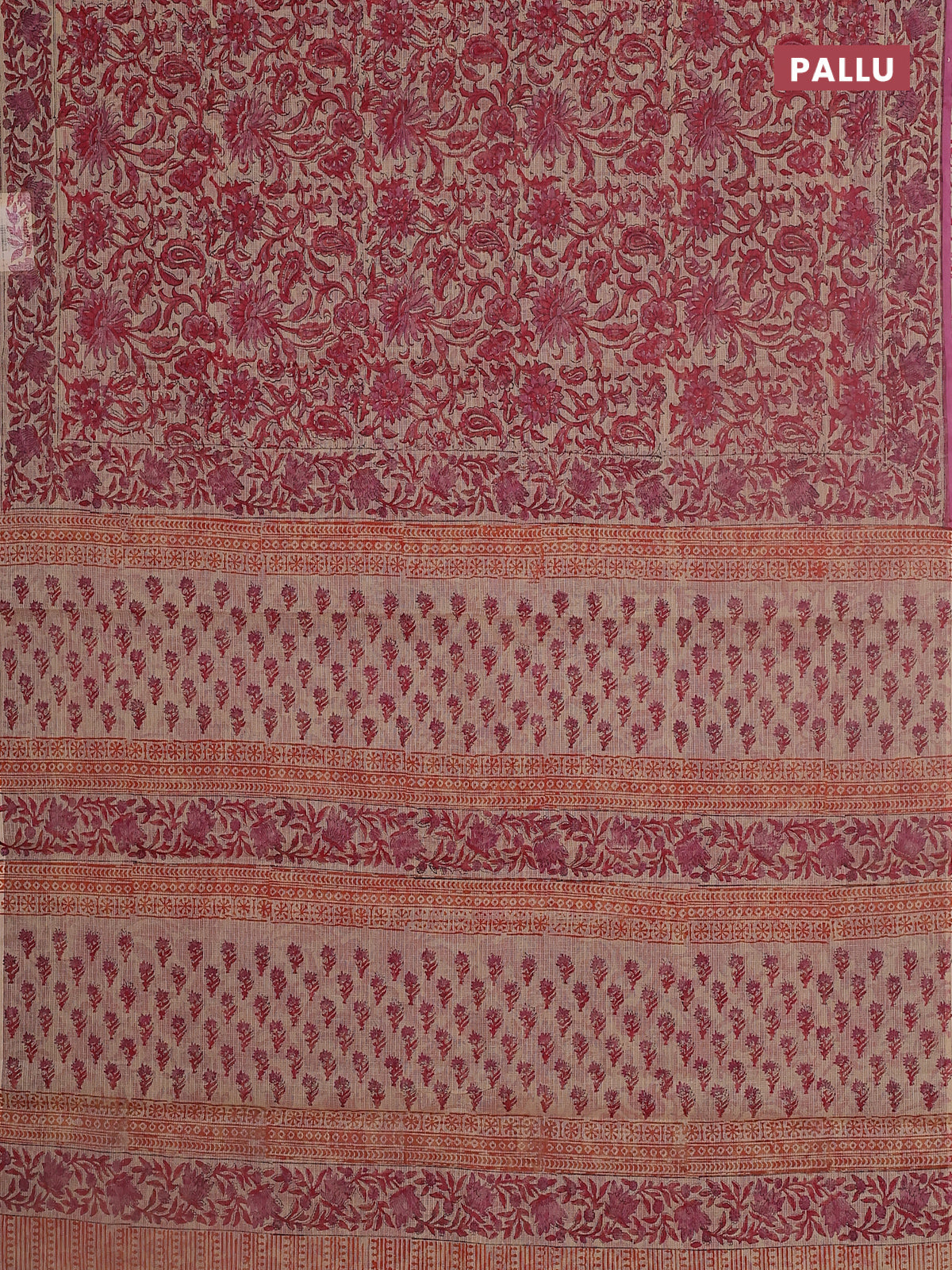 Kota doria saree beige and pink with allover block prints and printed border