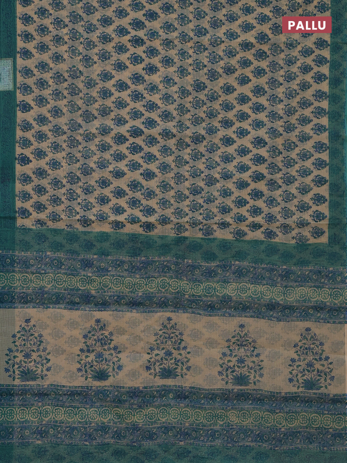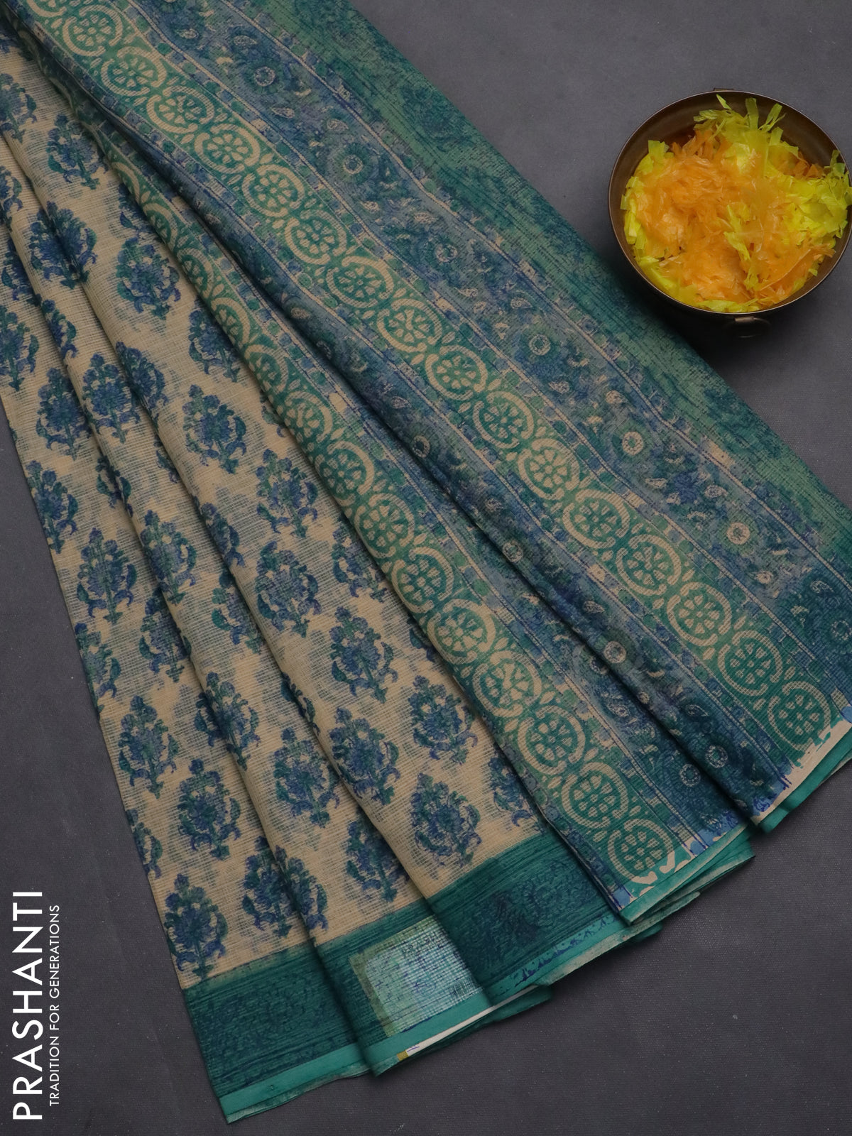 Kota doria saree beige and teal blue with allover block prints and printed border