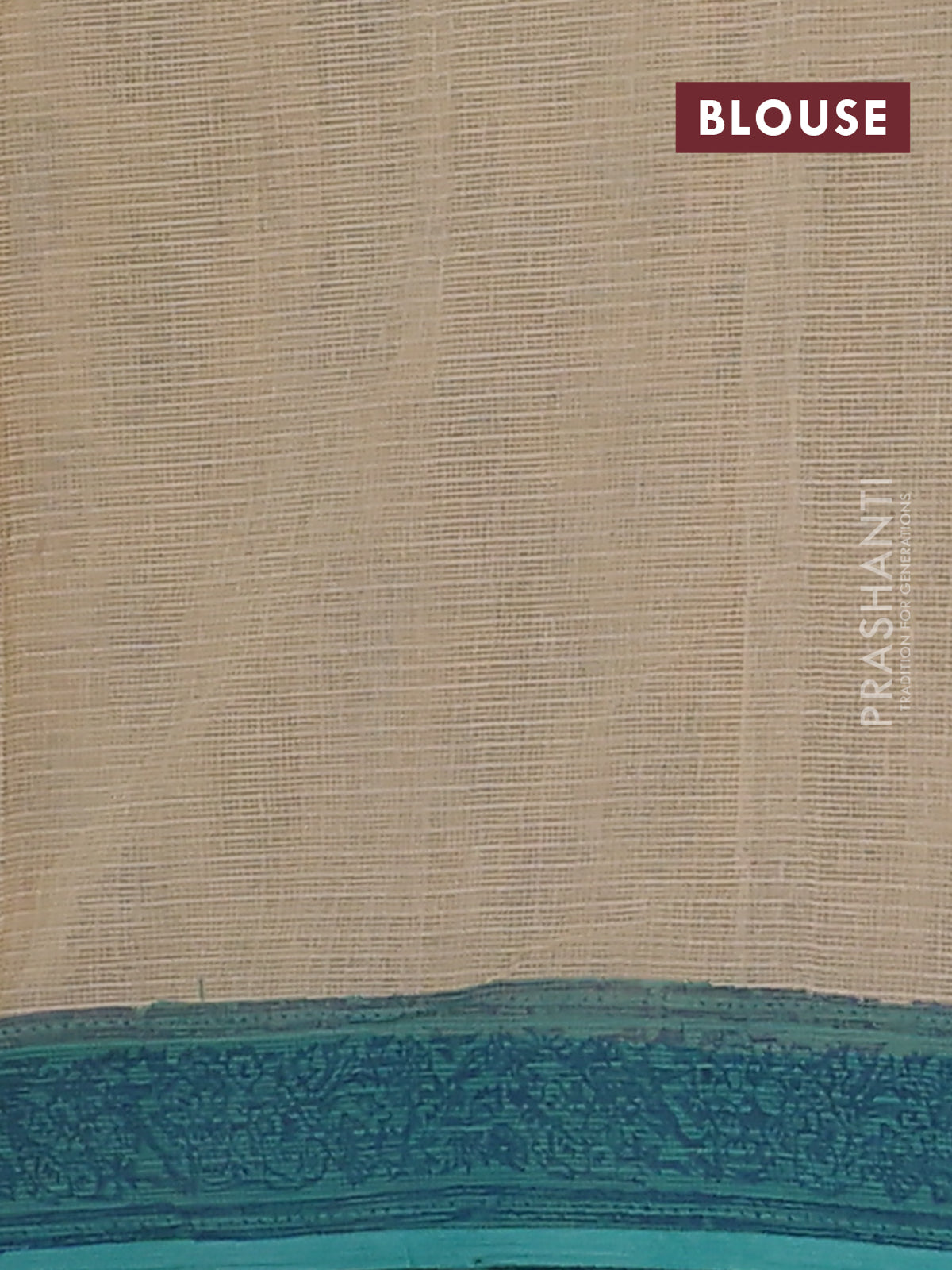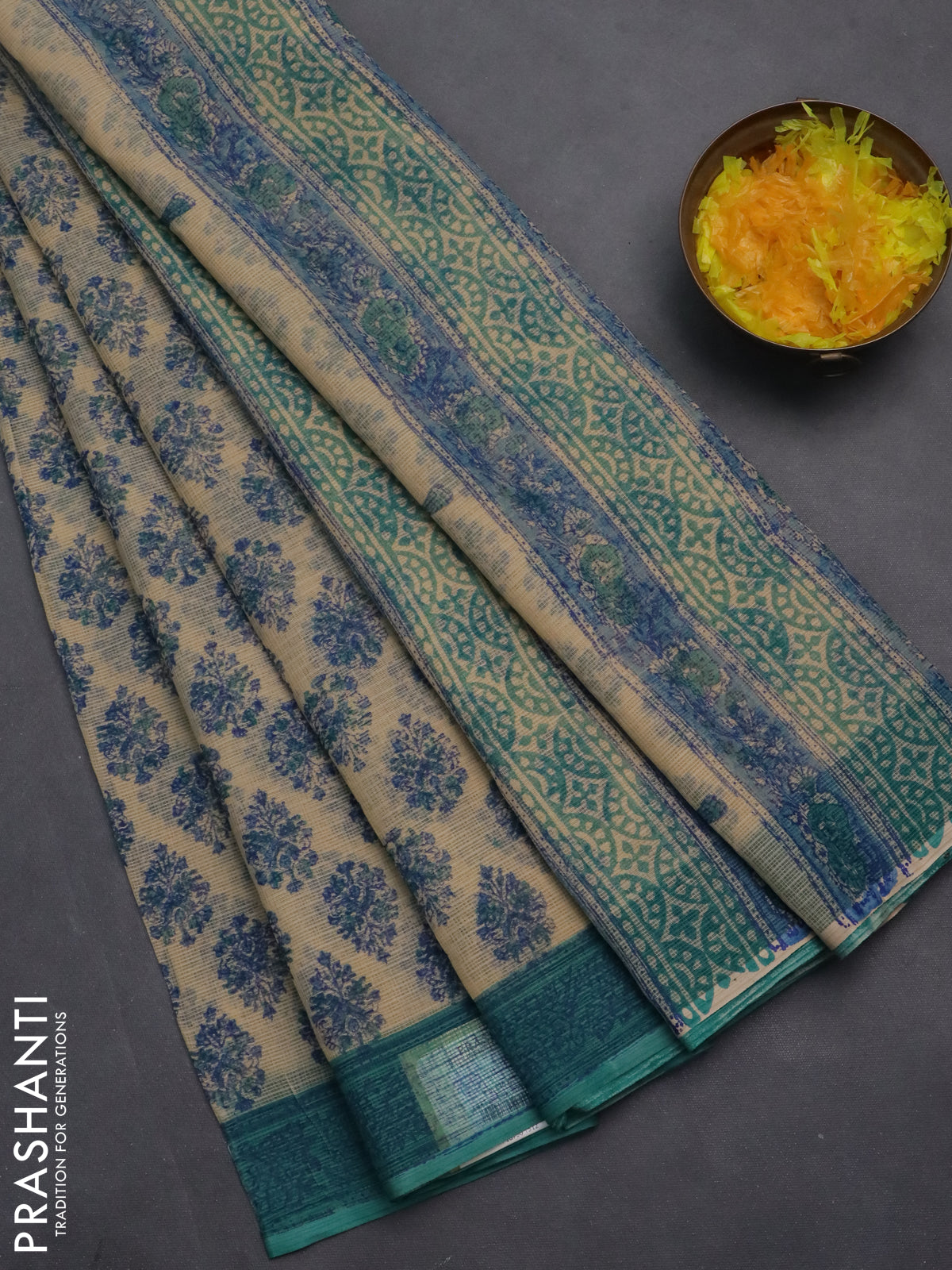 Kota doria saree beige and teal green shade with allover block prints and printed border