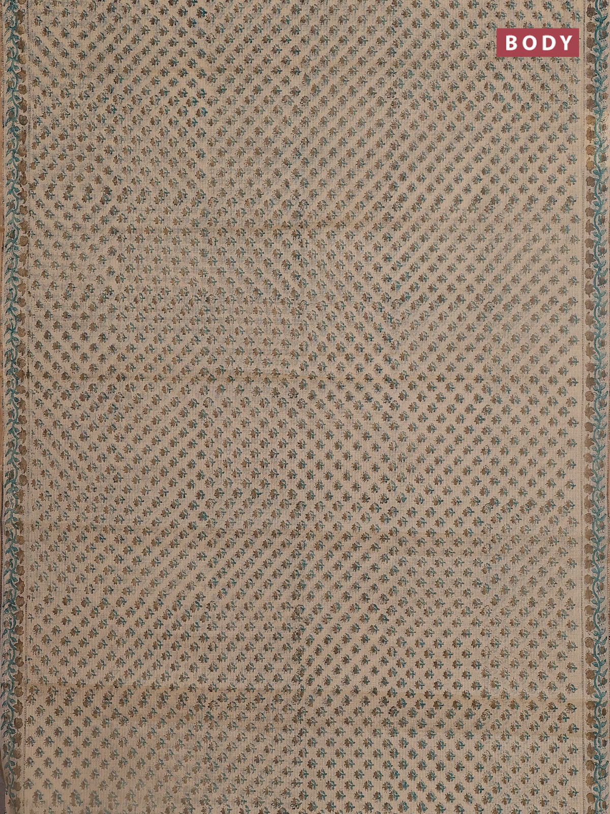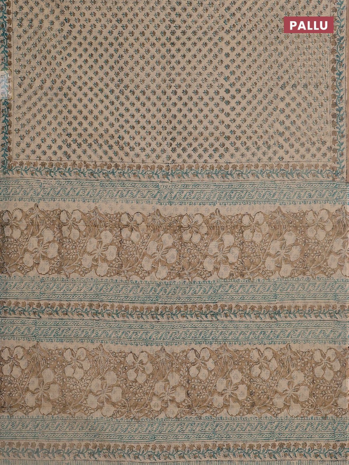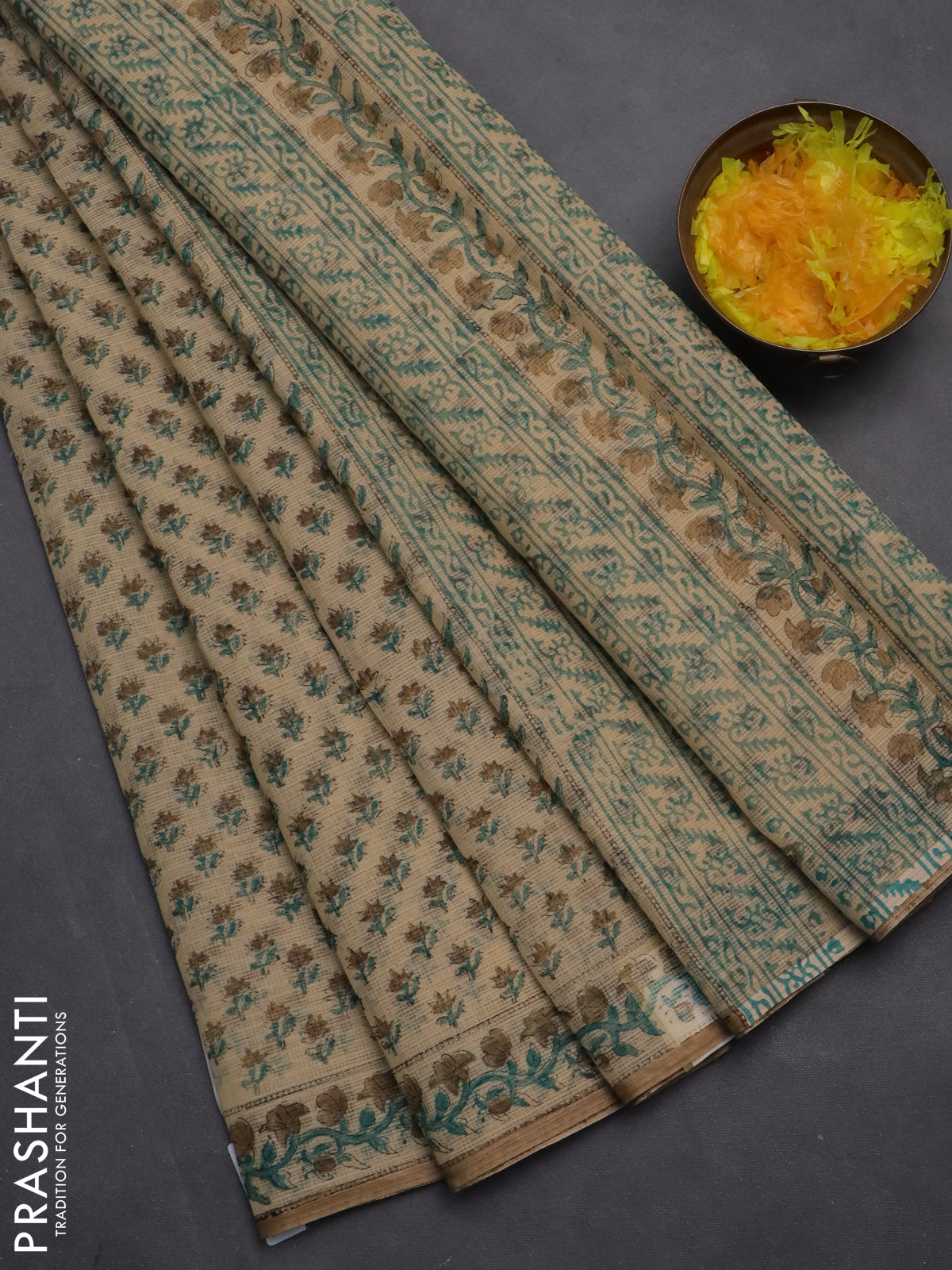 Kota doria saree beige teal green and dark sandal with allover block prints and printed border