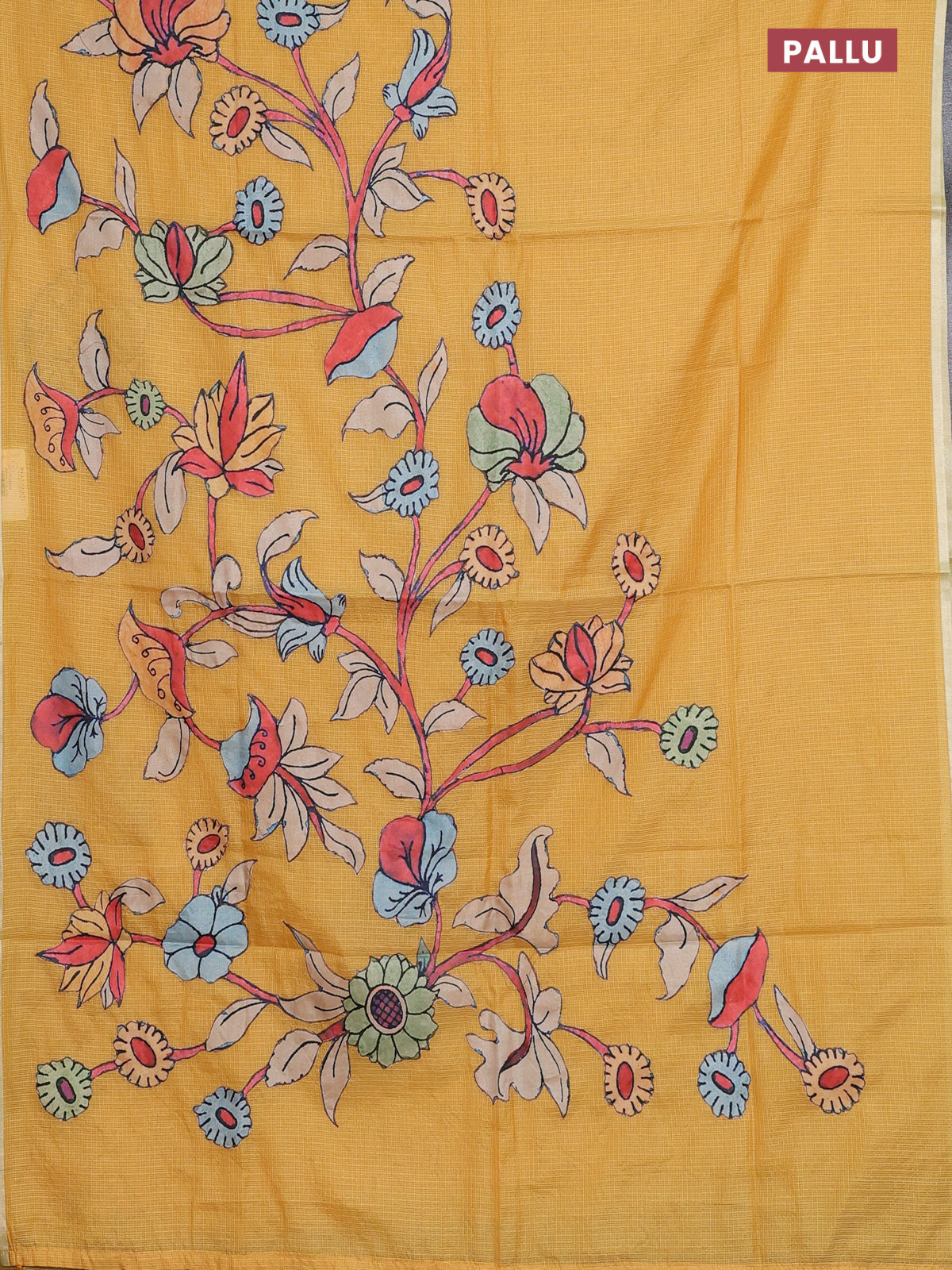 Kota saree yellow with kalamkari applique work and zari woven piping border