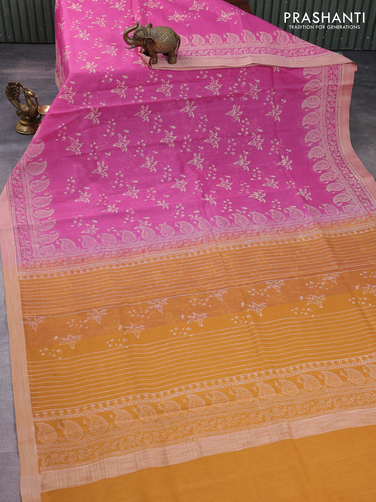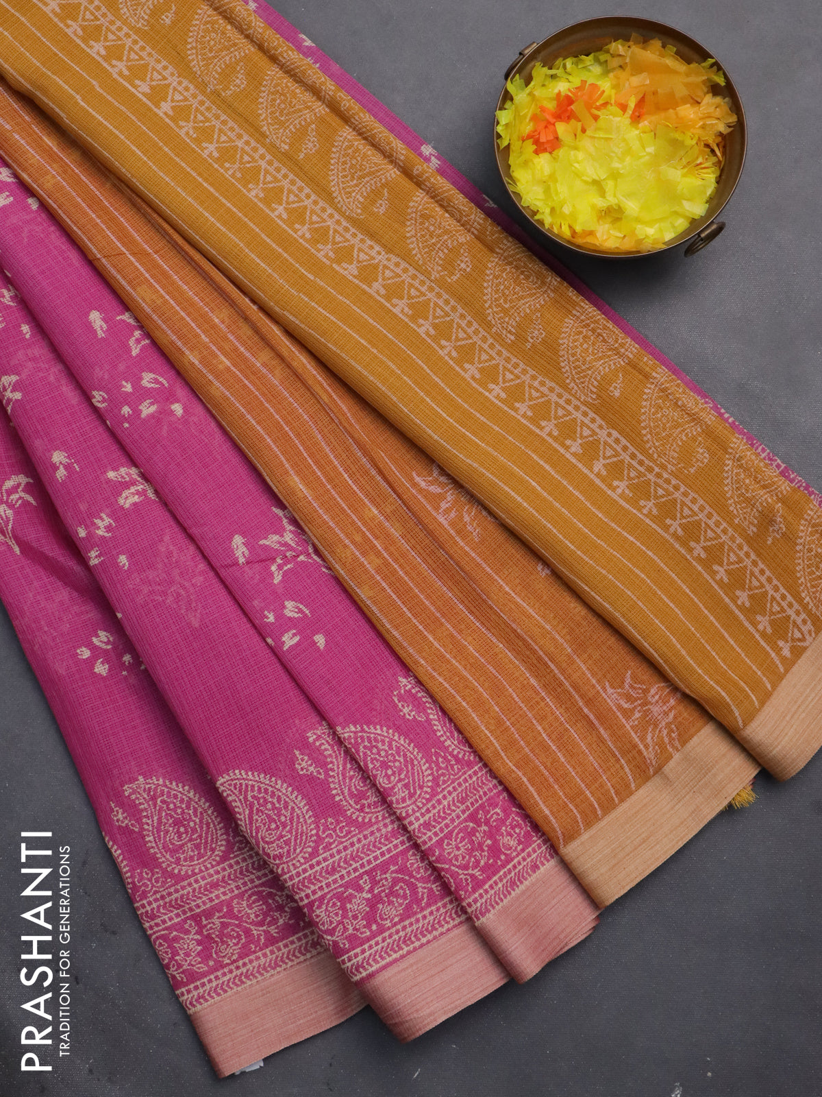 Kota silk cotton saree pink and dark mustard with butta block prints and block printed border
