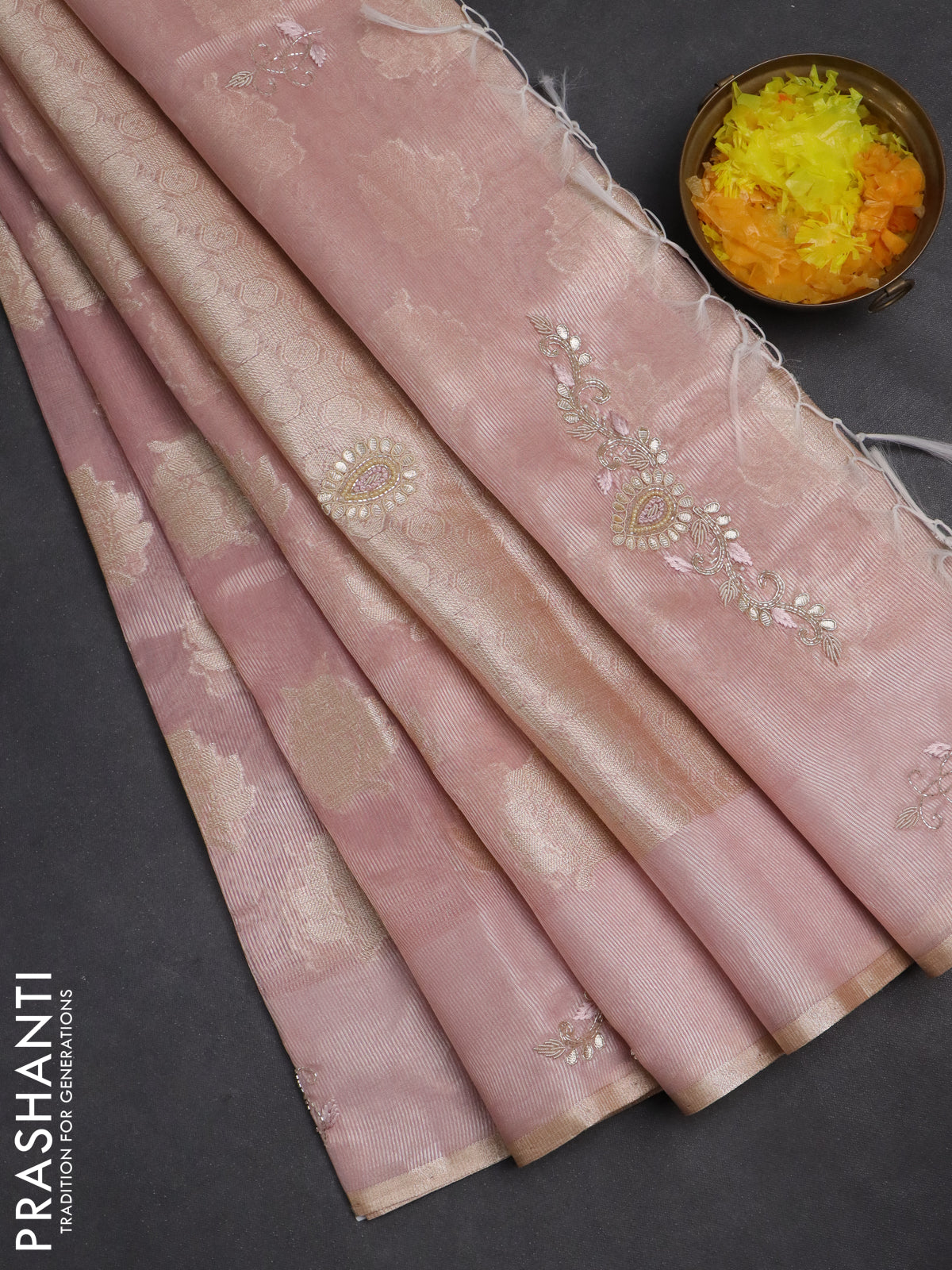 Kota tissue saree baby pink with zari woven floral buttas and embroidery butta border