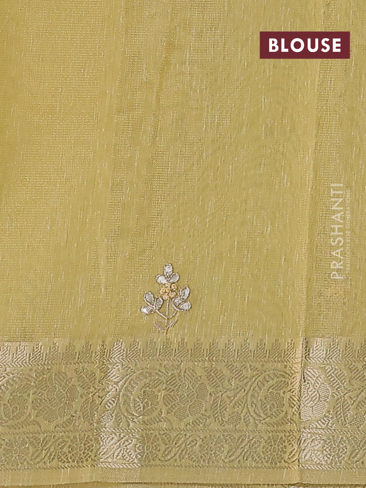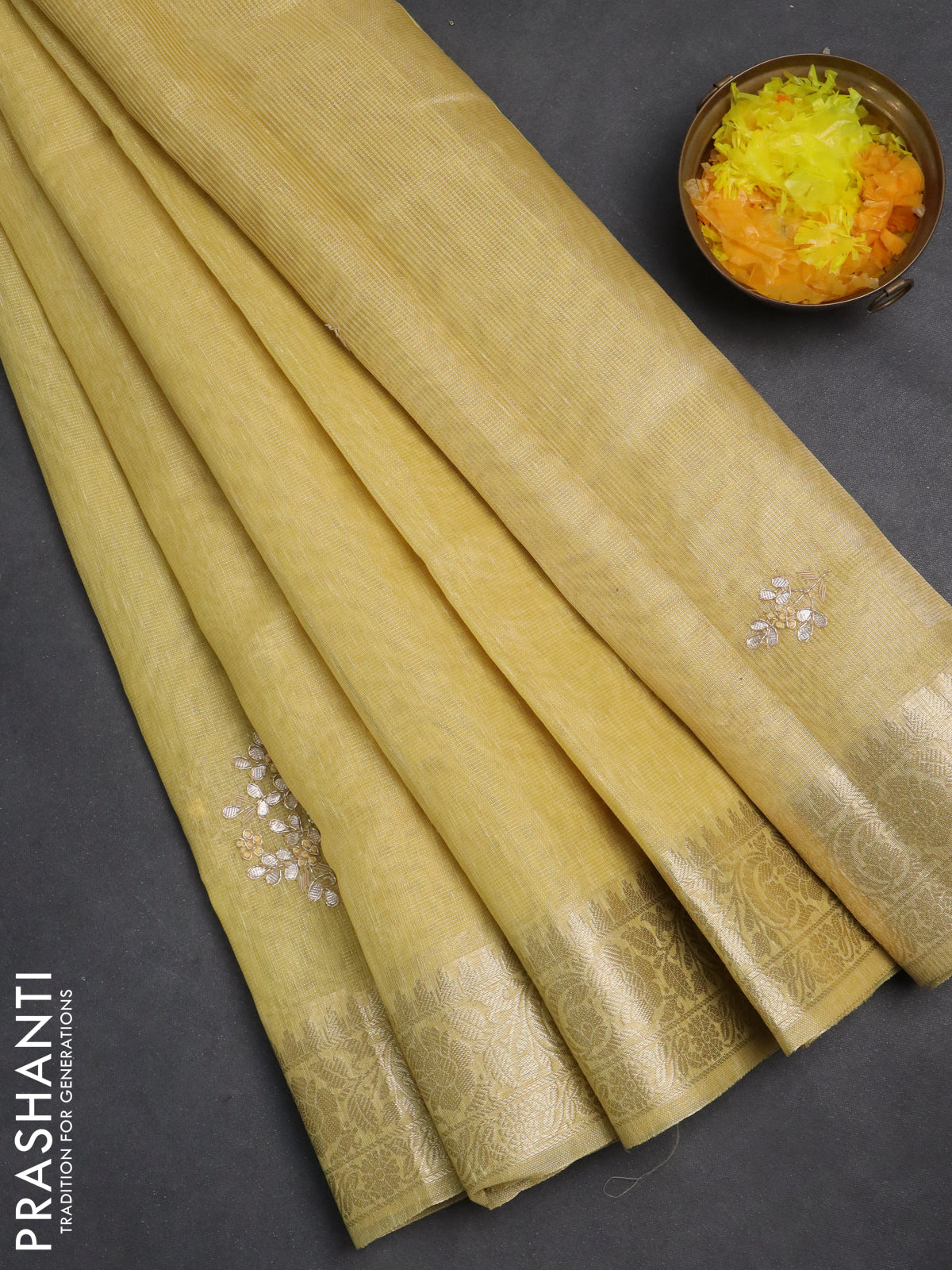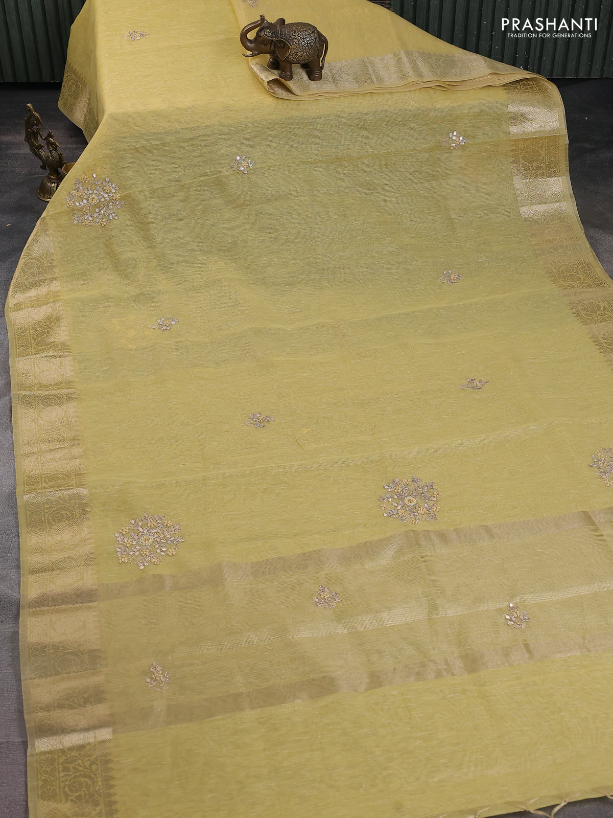 Kota tissue saree sandal with embroidery buttas and zari woven border