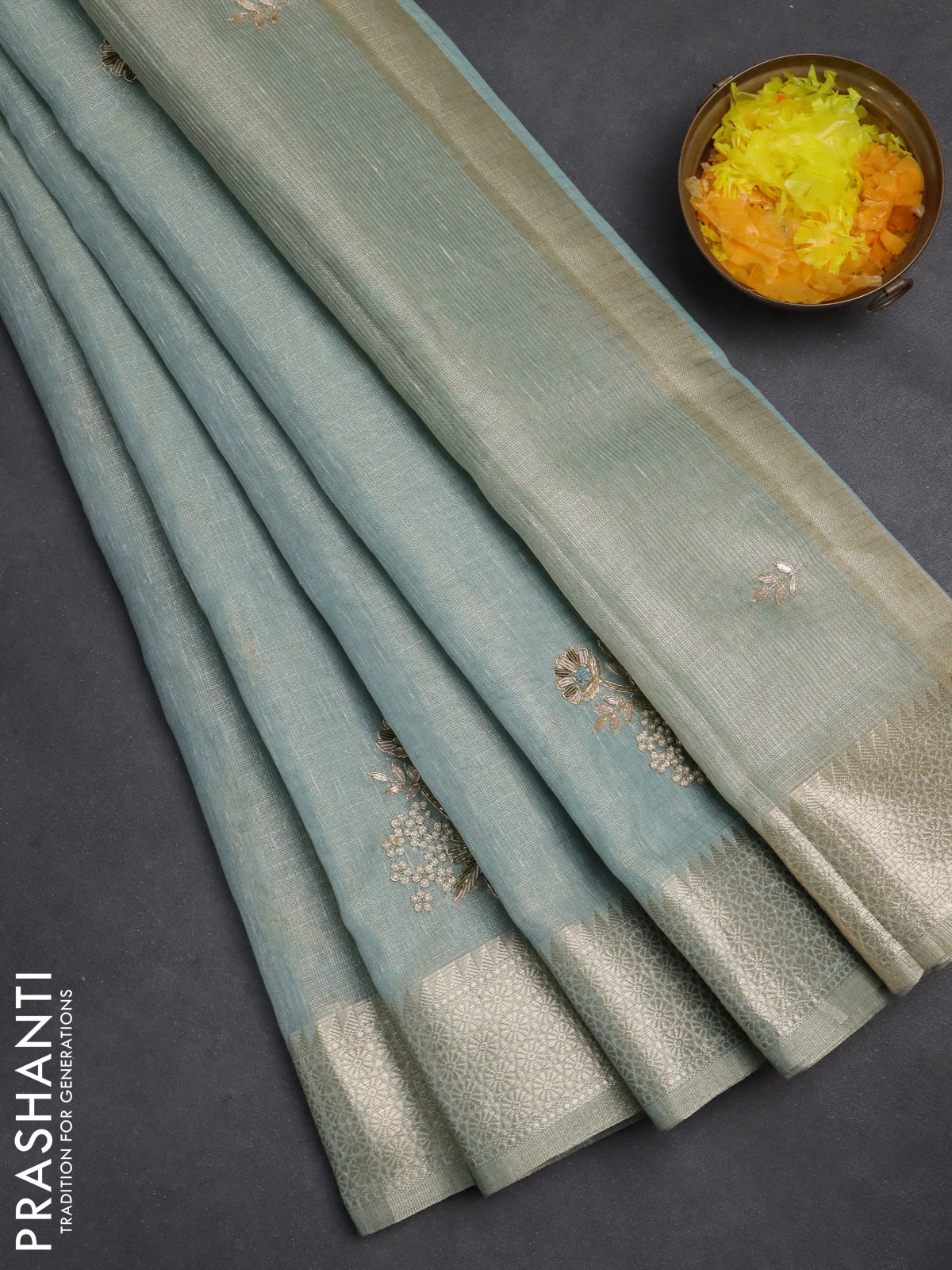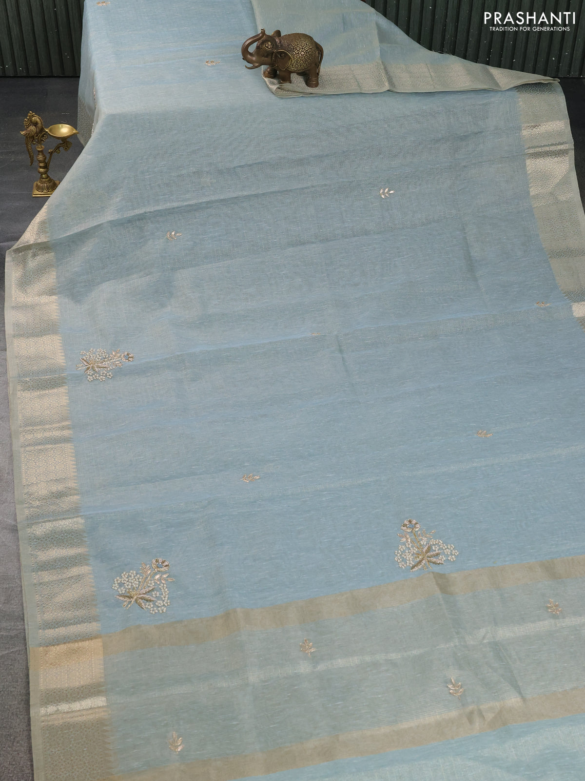 Kota tissue saree teal blue with embroidery buttas and zari woven border