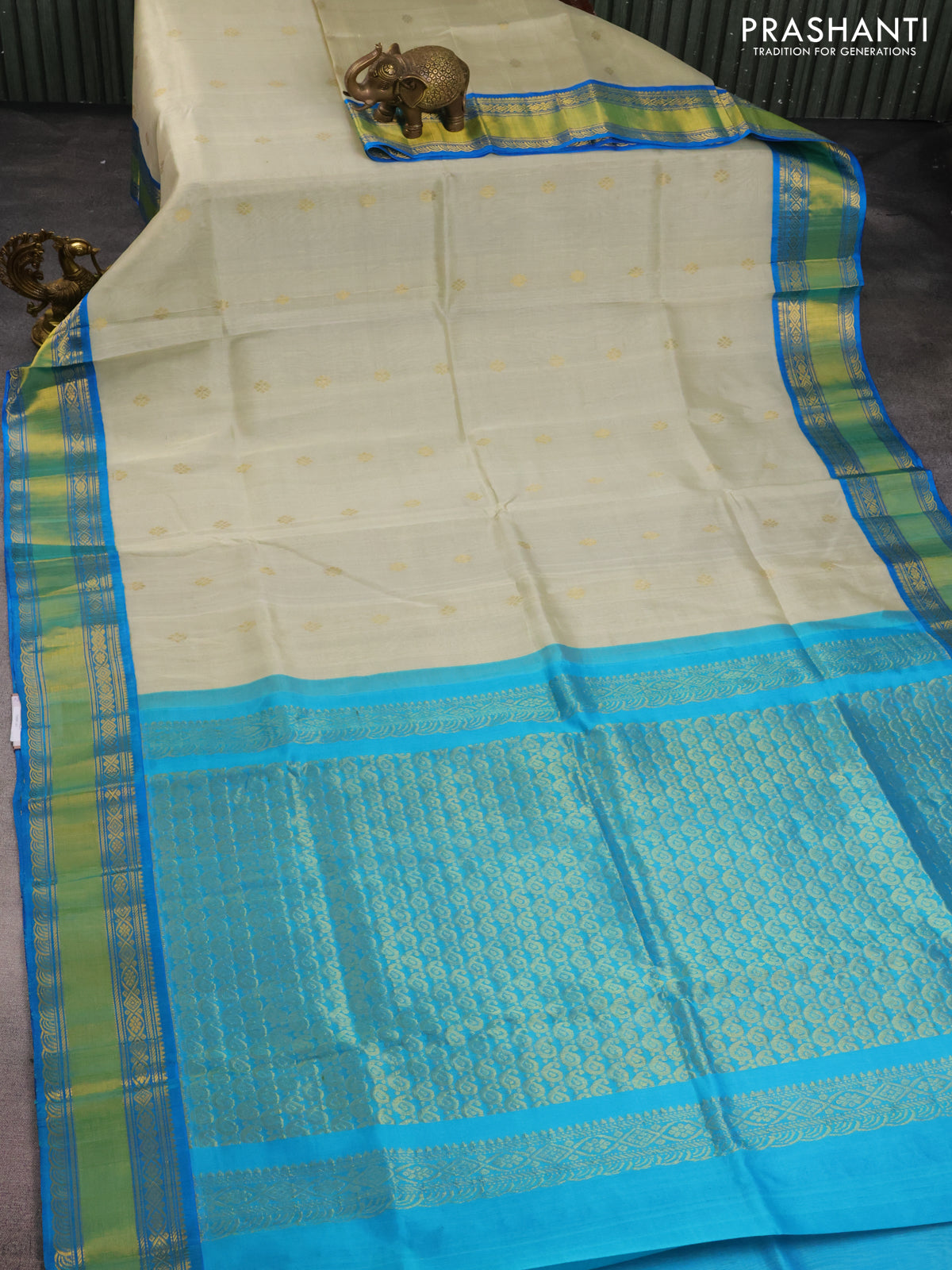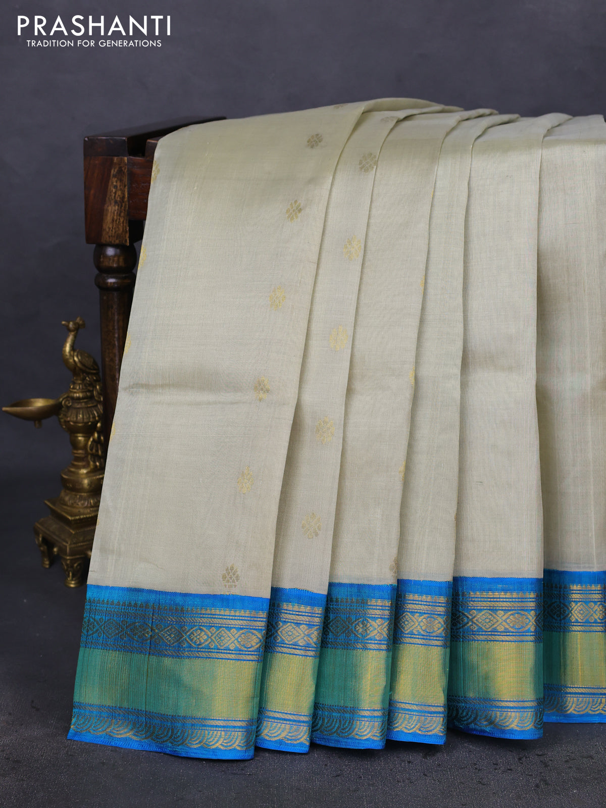 Kuppadam silk cotton saree beige and cs blue with zari woven buttas and zari woven border