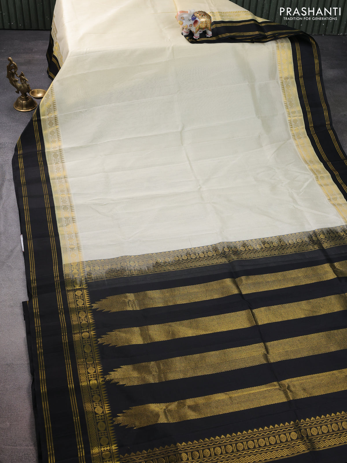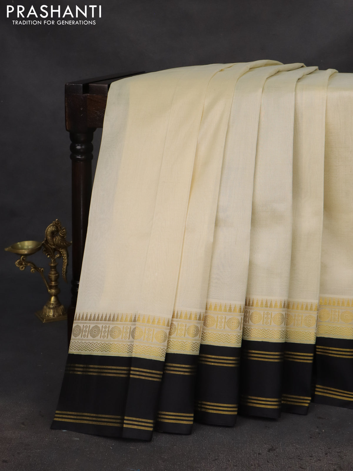 Kuppadam silk cotton saree cream and black with plain body and rettapet zari woven border
