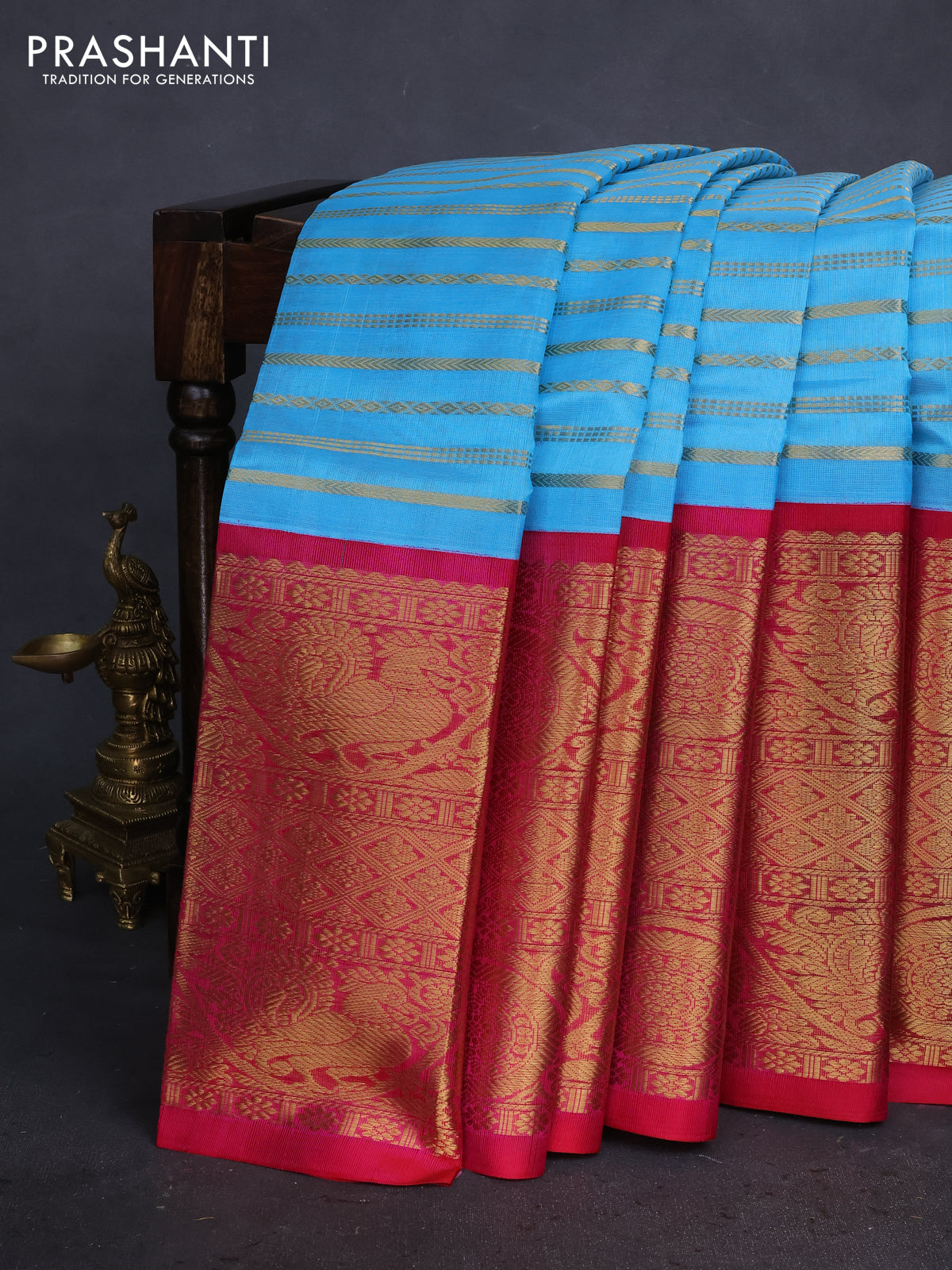 Kuppadam silk cotton saree light blue and pink with allover veldhari pattern and long zari woven border