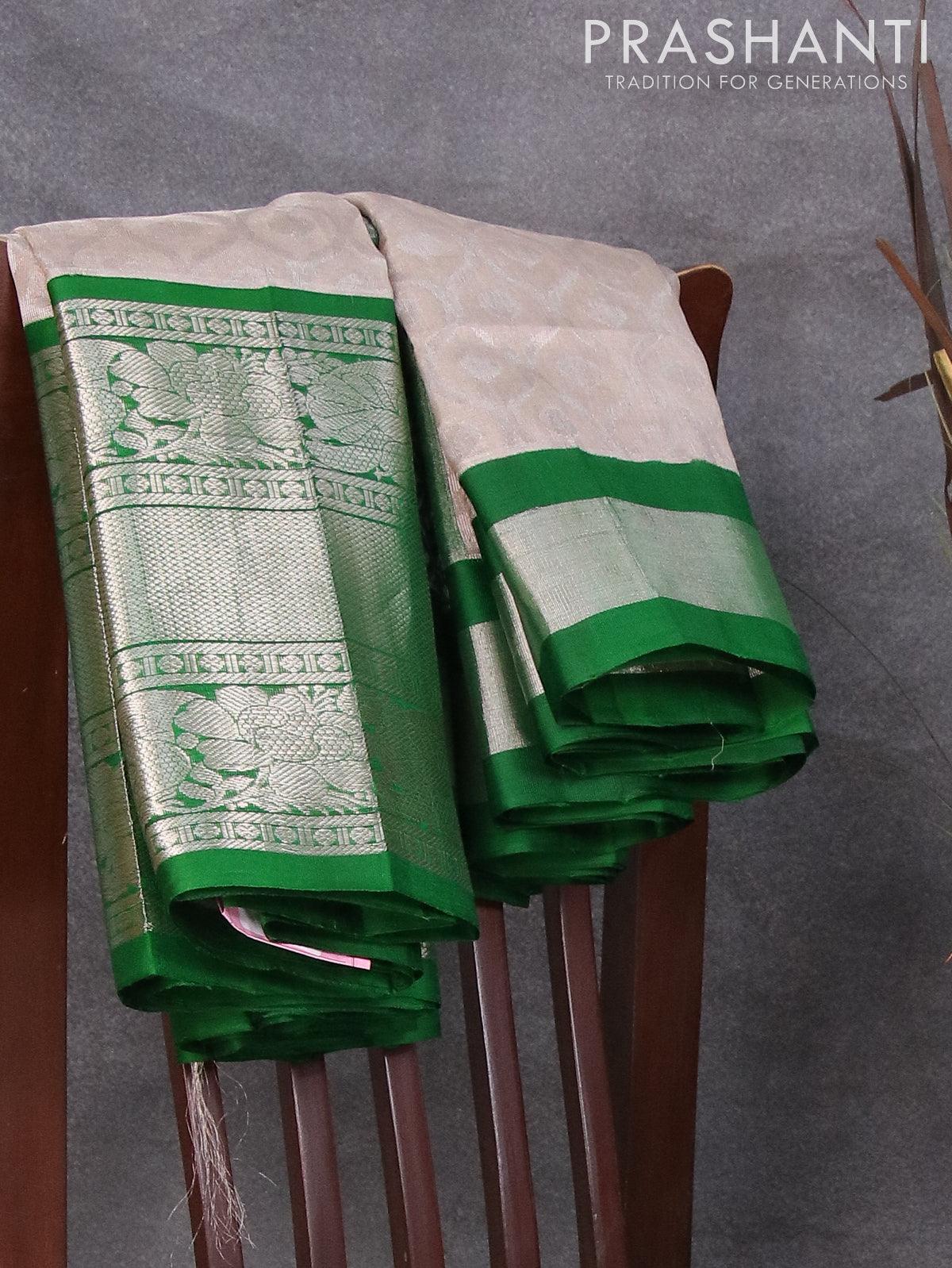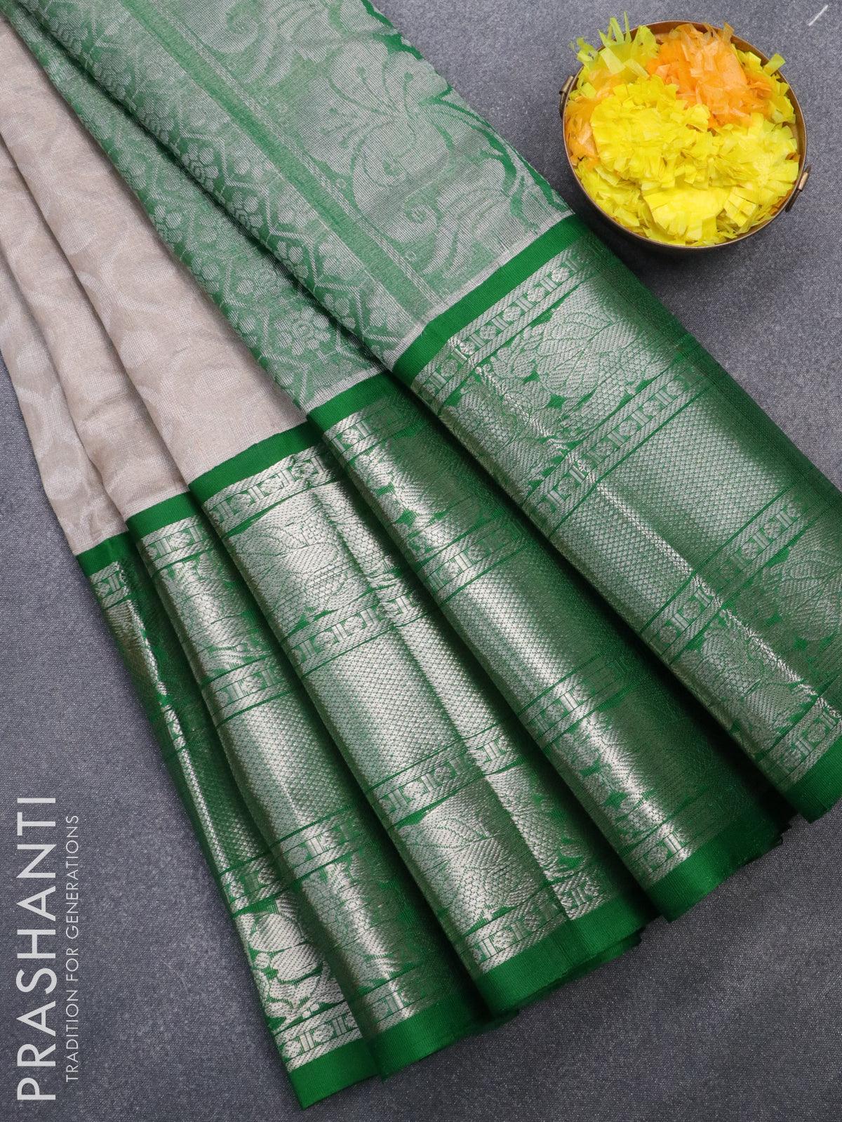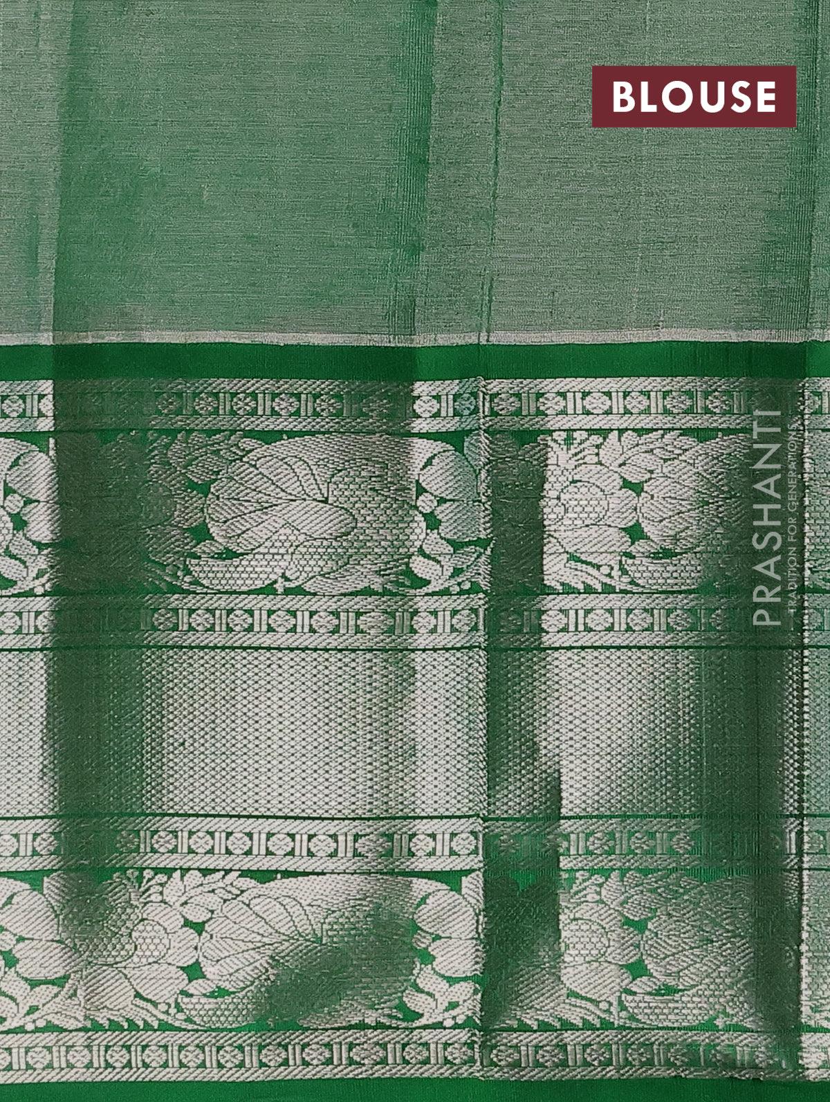 Kuppadam tissue silk cotton saree grey and dark green with allover silver zari woven brocade weaves and long annam & floral silver zari woven border