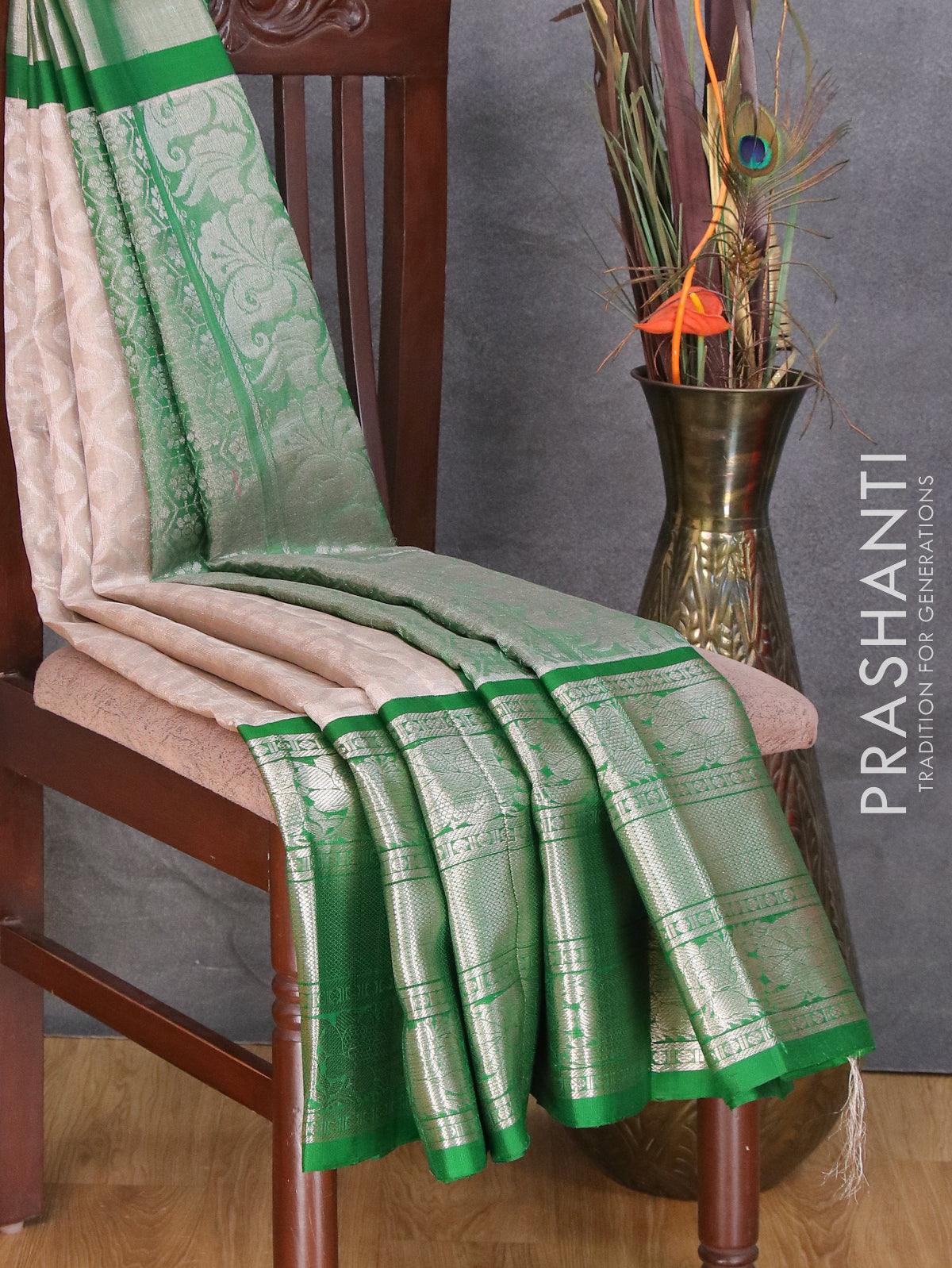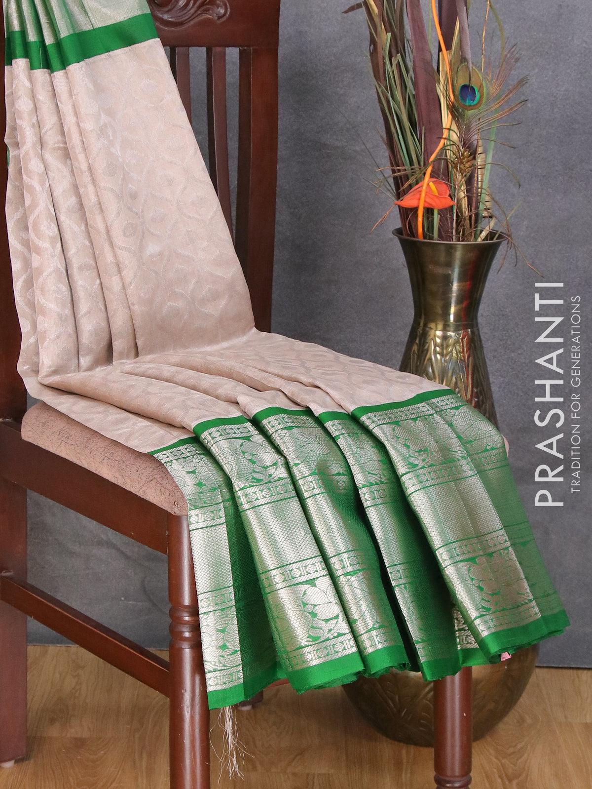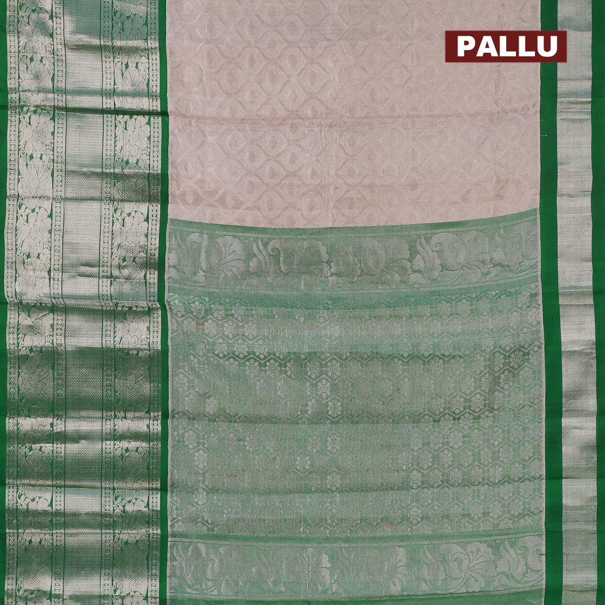 Kuppadam tissue silk cotton saree grey and dark green with allover silver zari woven brocade weaves and long annam & floral silver zari woven border