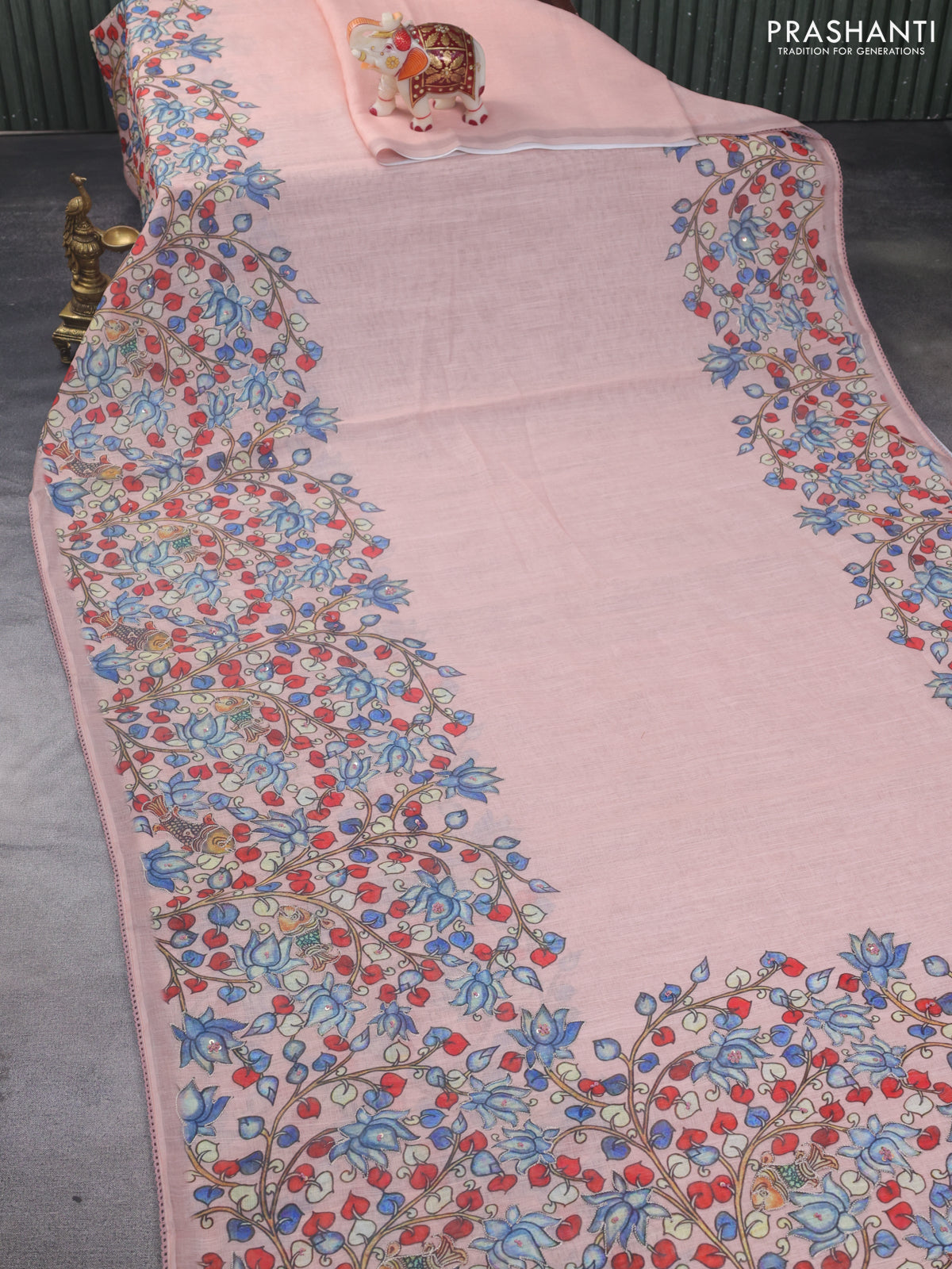 Linen cotton saree mild peach shade with plain body and kalamkari prints & pita border