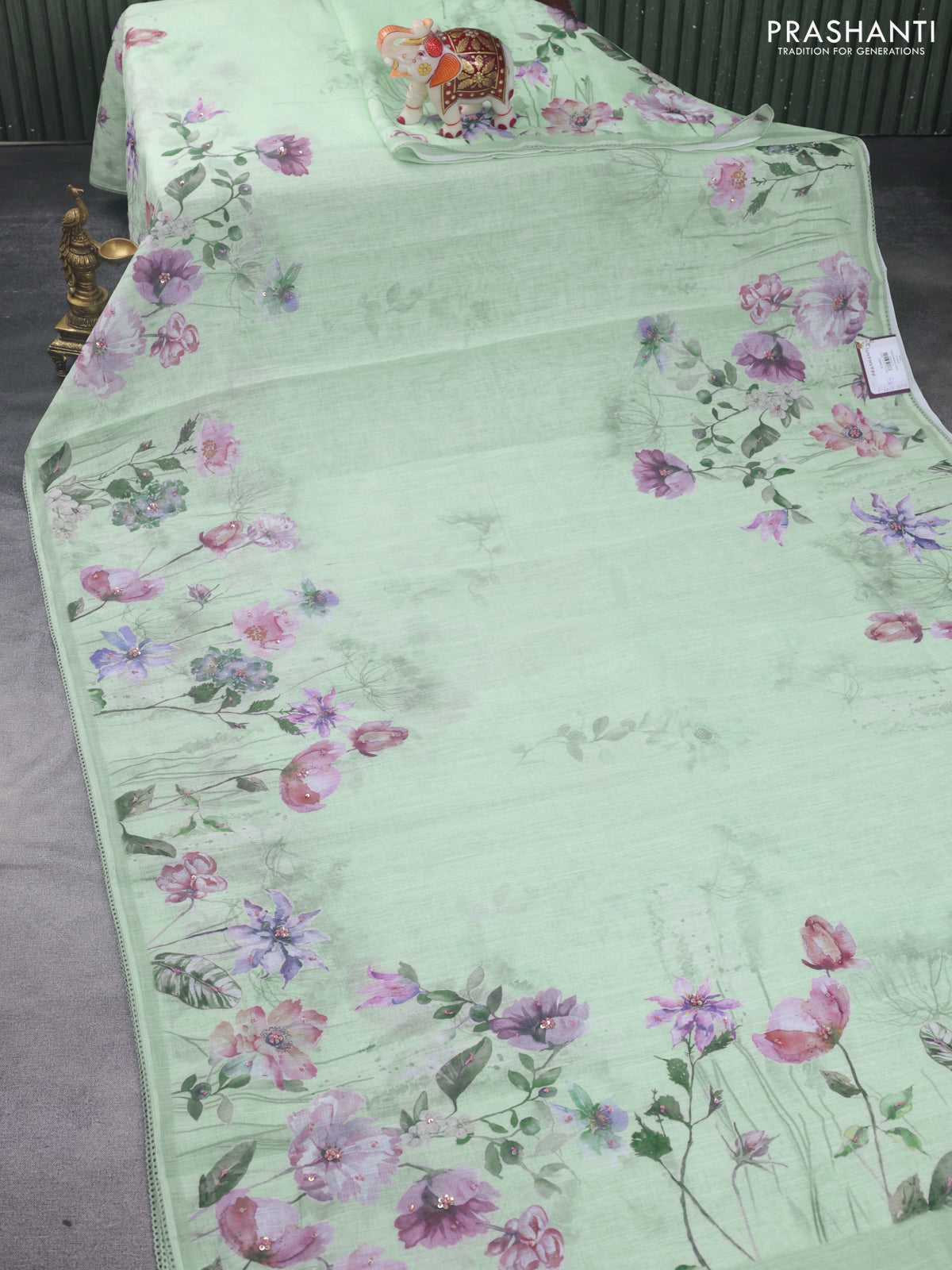 Linen cotton saree pastel green with plain body and floral prints & french knot work