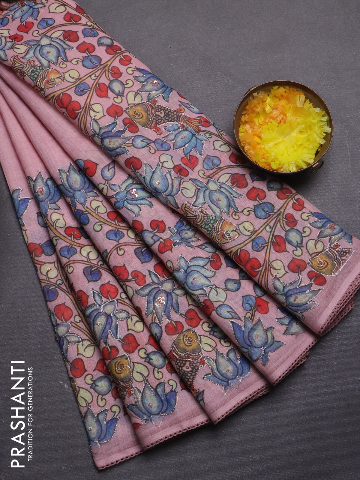 Linen cotton saree pastel pink with plain body and kalamkari prints & pita border