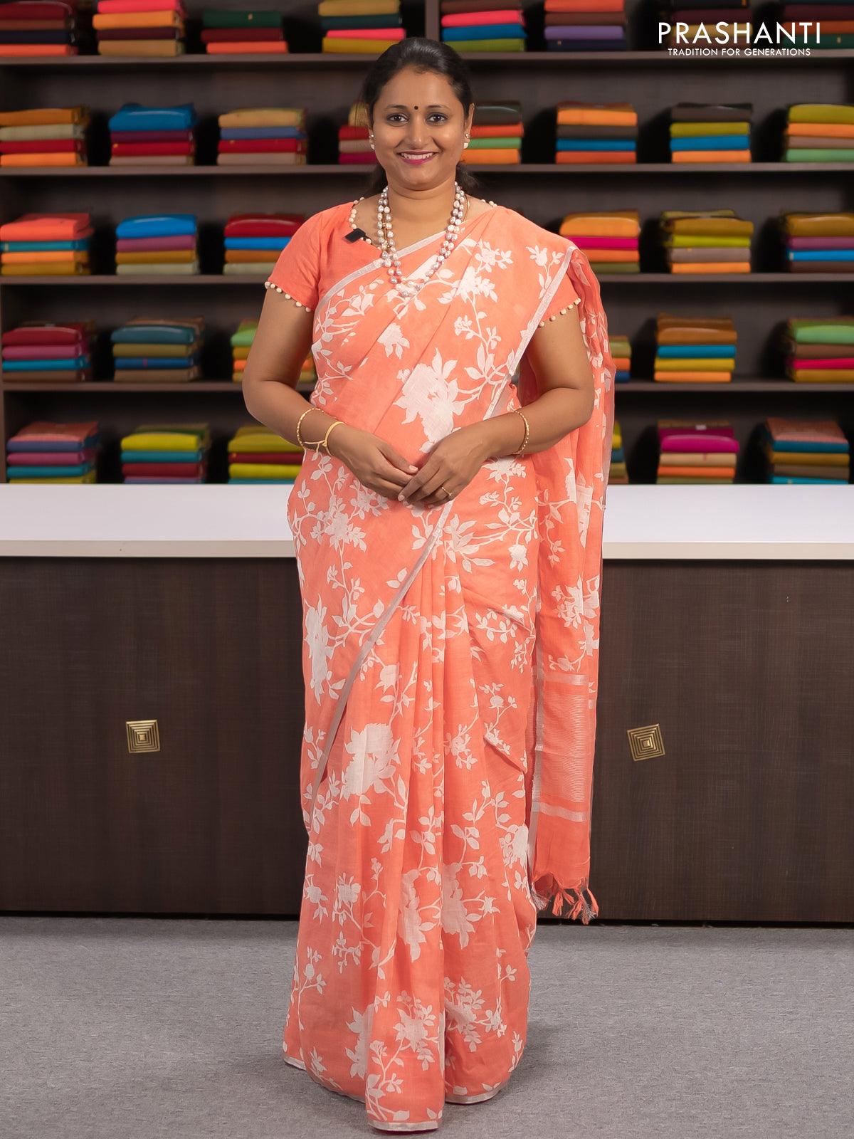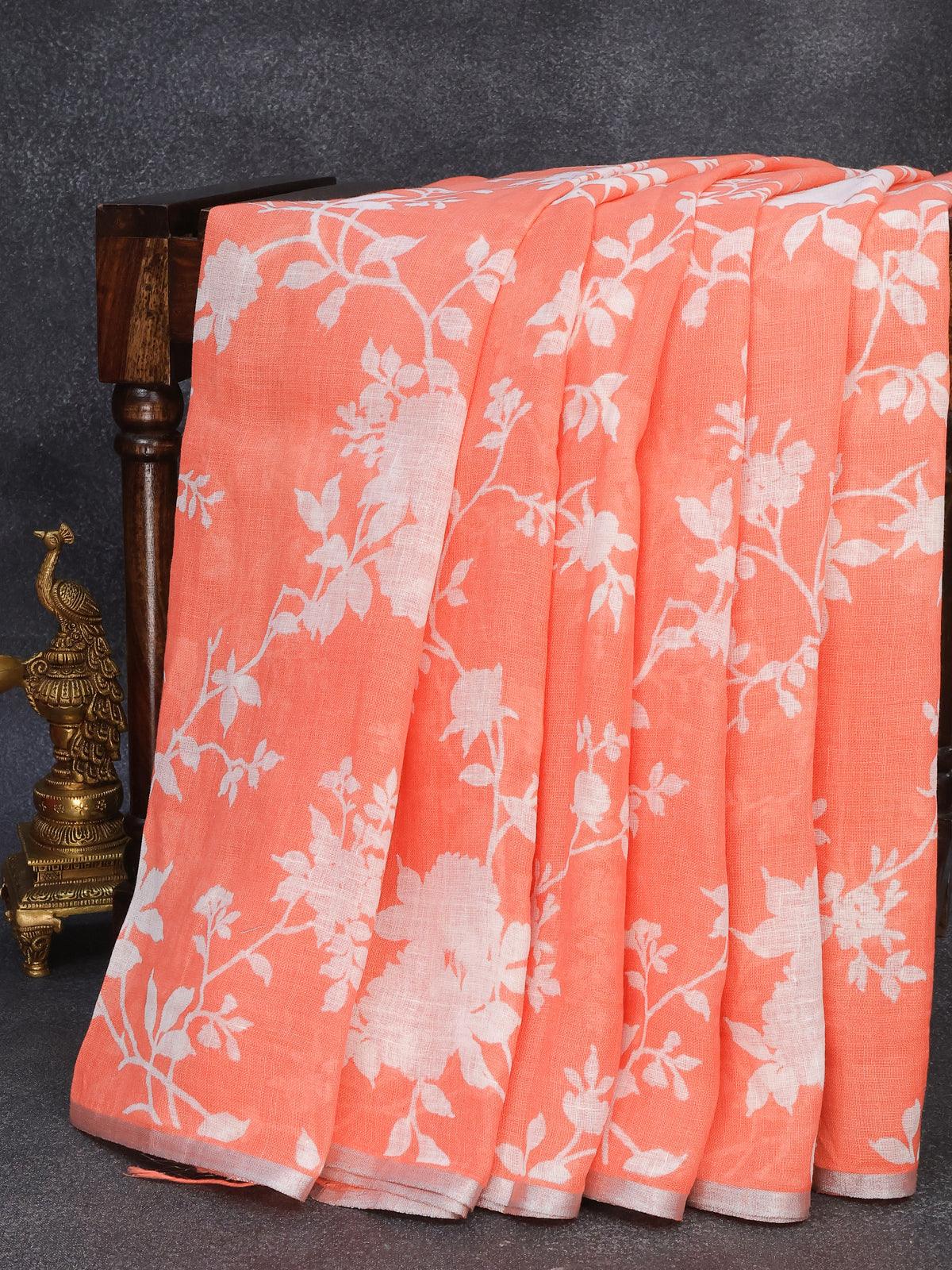 Linen cotton saree peach orange with allover floral prints and small silver zari woven border