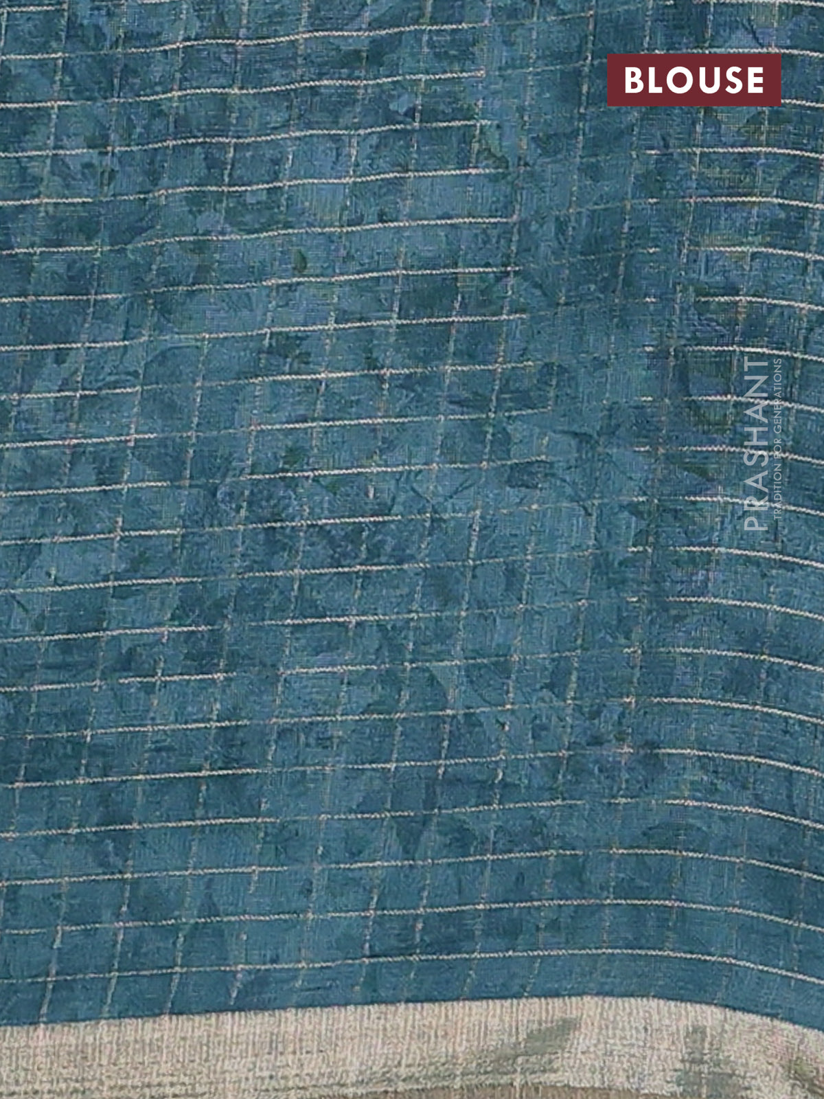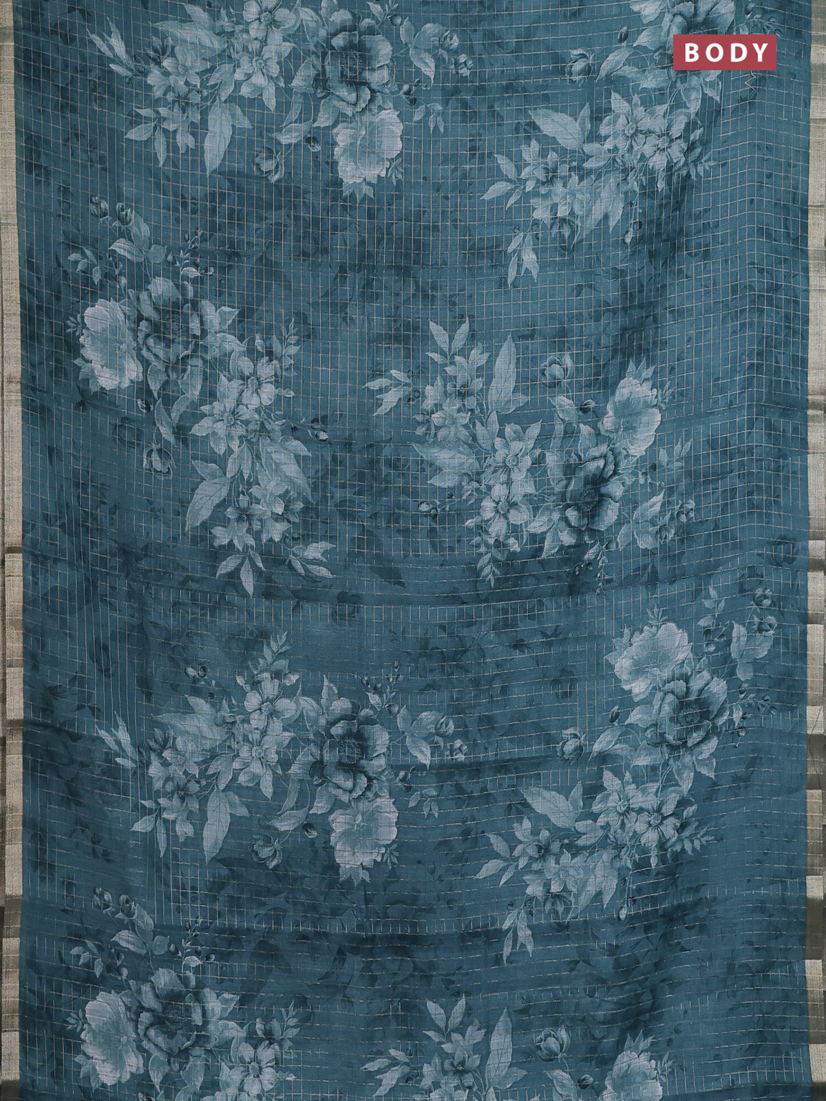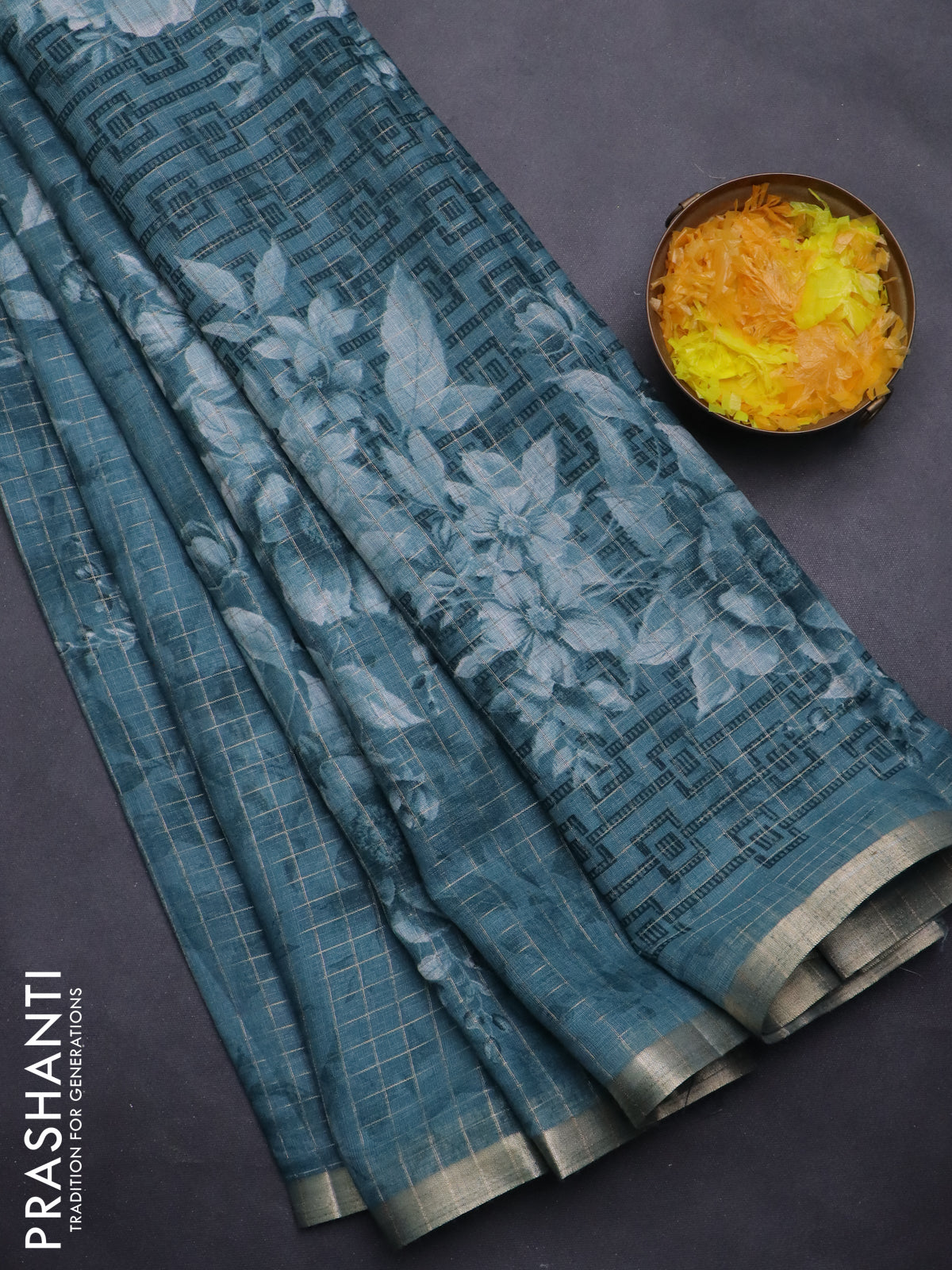 Linen cotton saree peacock blue with allover floral prints & zari checks and zari woven border