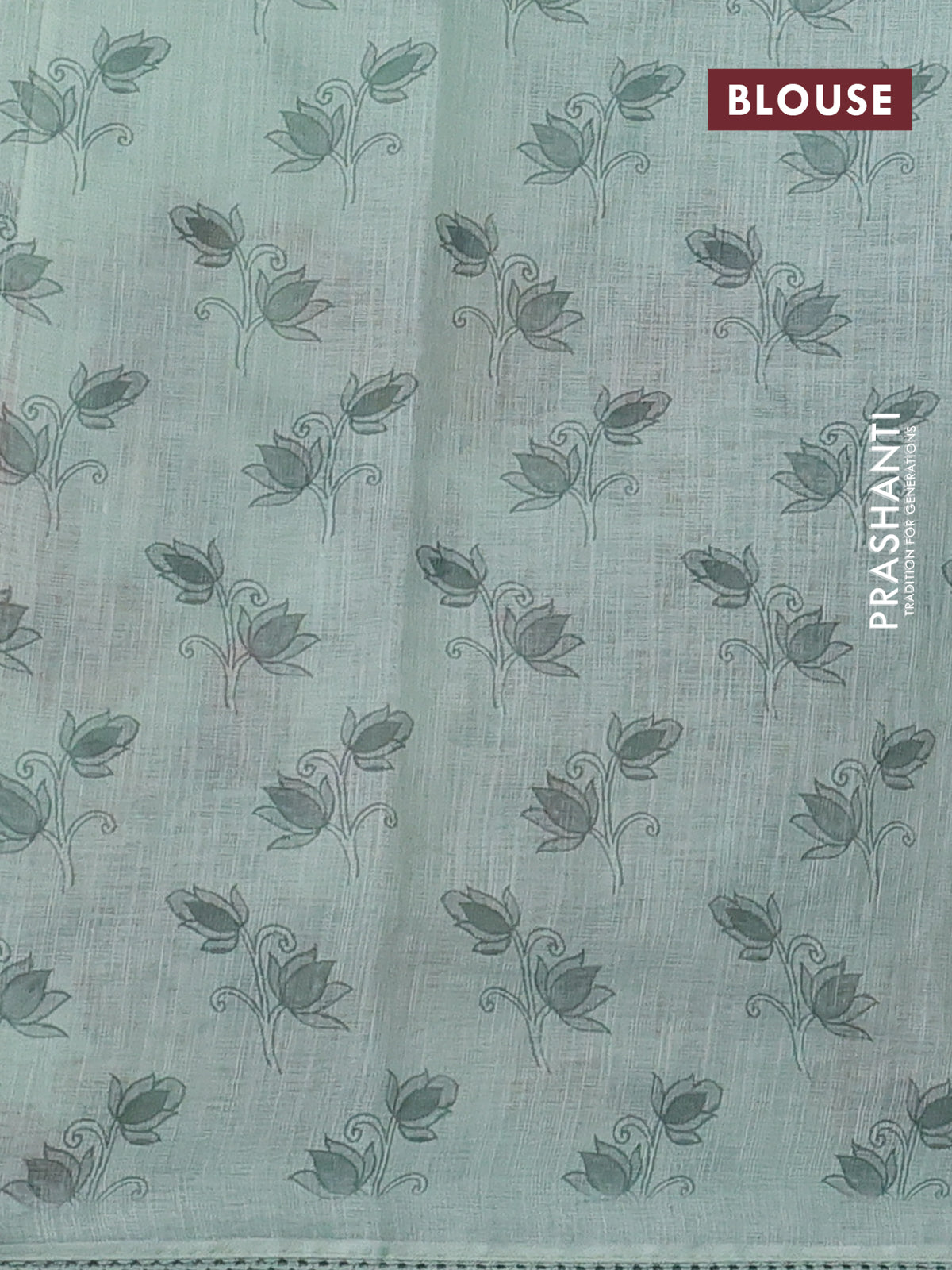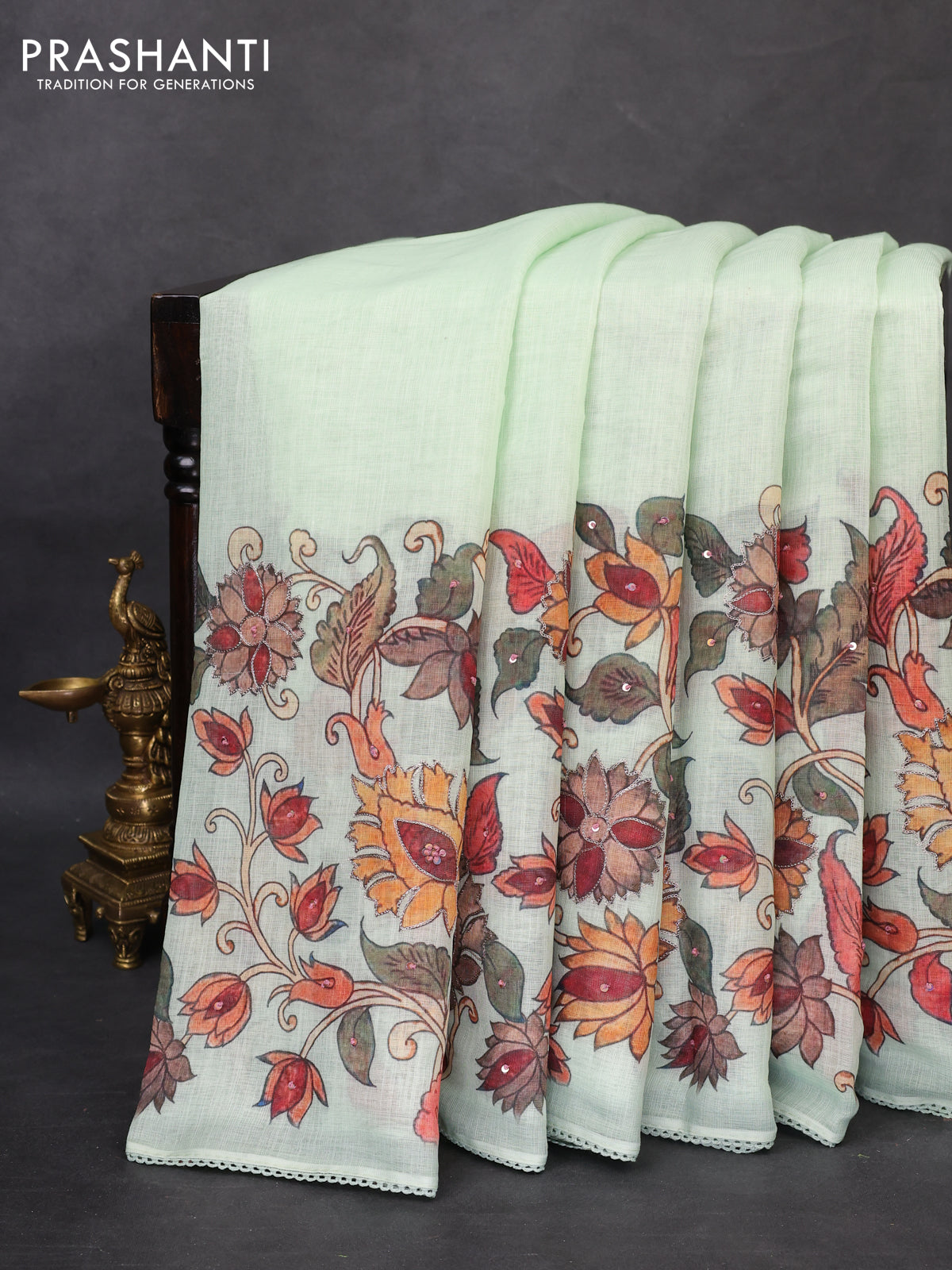 Linen cotton saree pista green with plain body and long kalamkari printed & embroidery work border