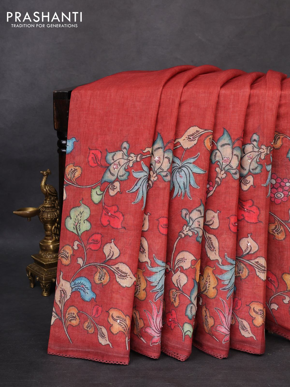 Linen cotton saree rust shade with plain body and long kalamkari printed & embroidery work border