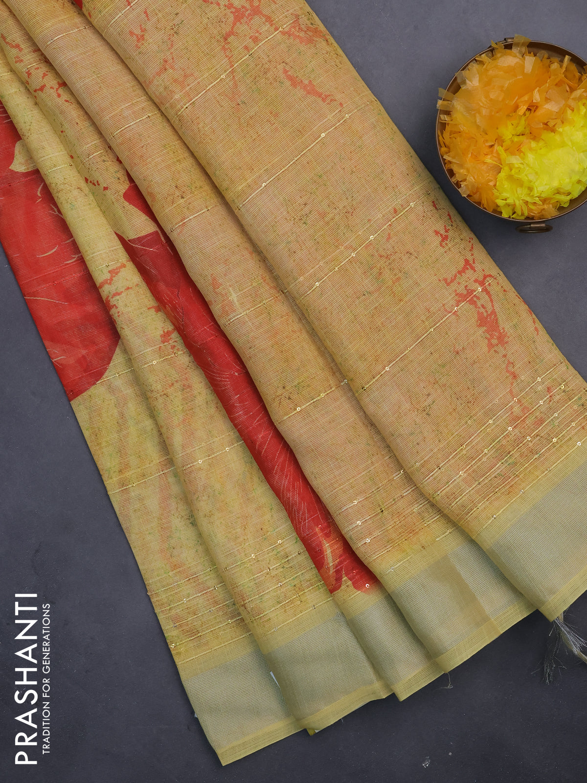 Linen cotton saree yellow with allover prints & sequin work and silver zari woven border