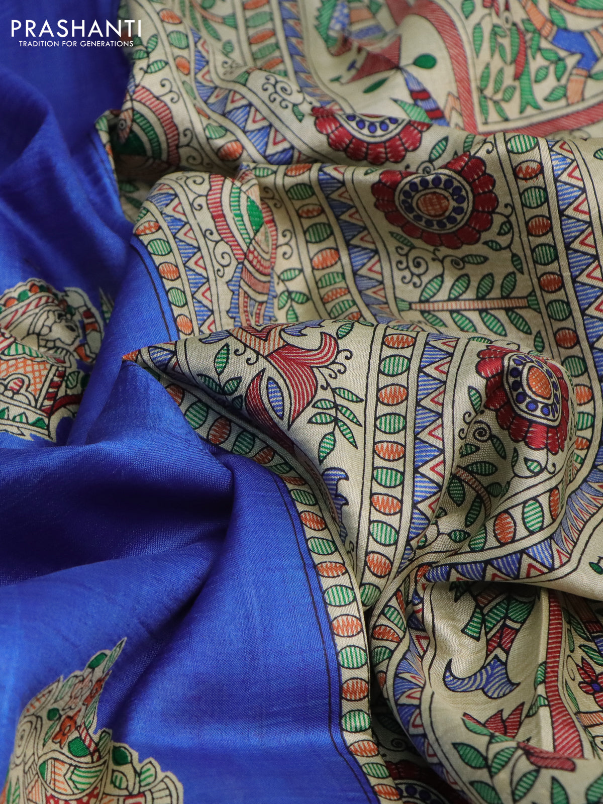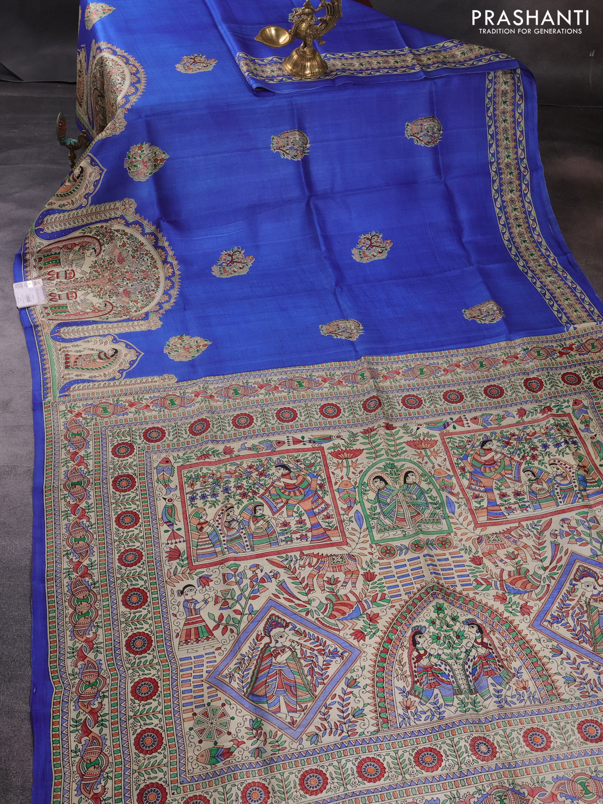 Madhubani printed silk saree Ink Blue and Beige with butta prints and long madhubani printed border