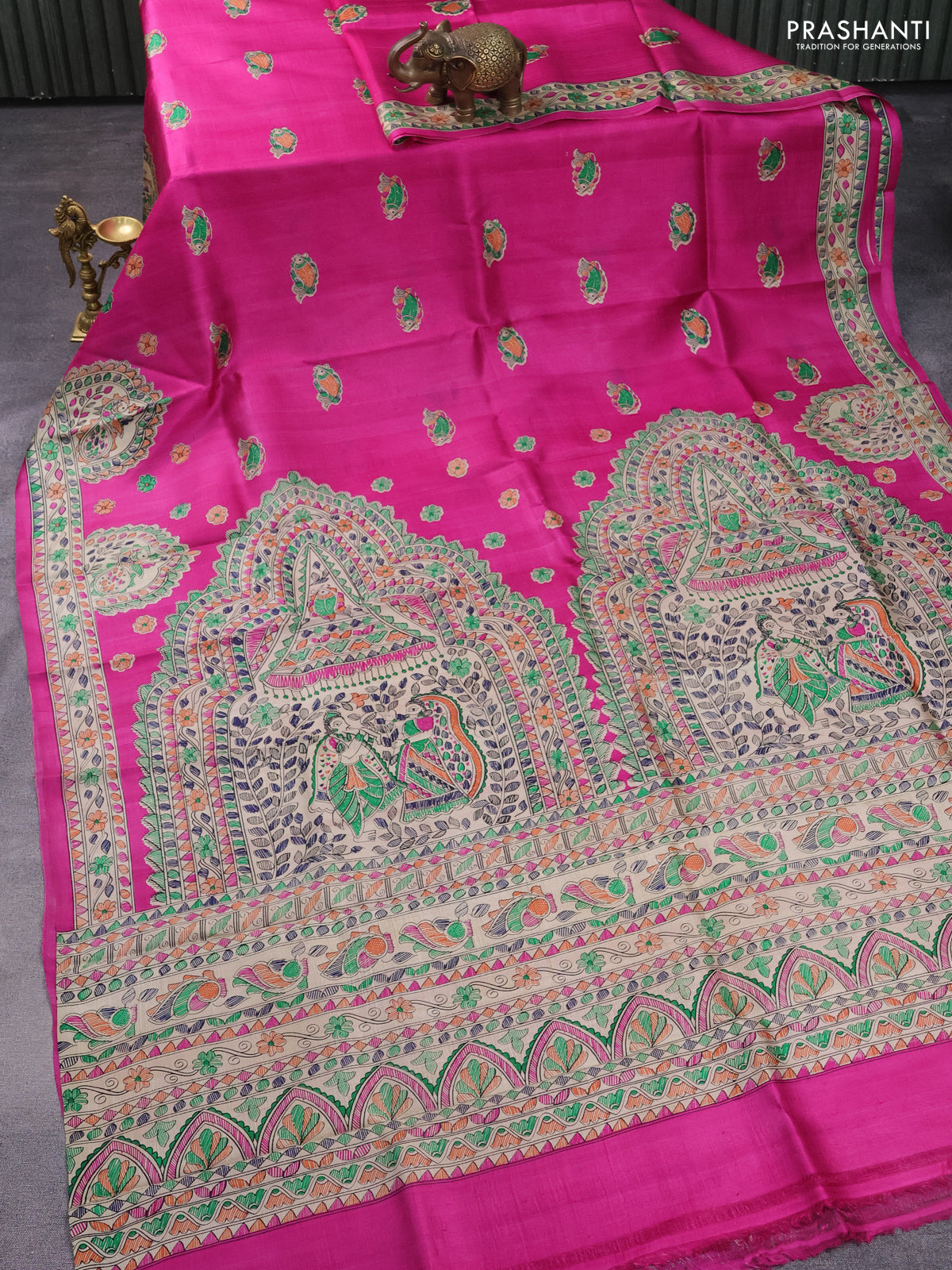 Madhubani printed silk saree Pink and Beige with butta prints and madhubani printed border