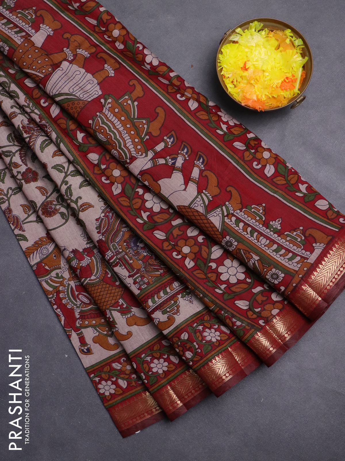 Maheshwari cotton saree beige and maroon with allover kalamkari prints and zari woven border