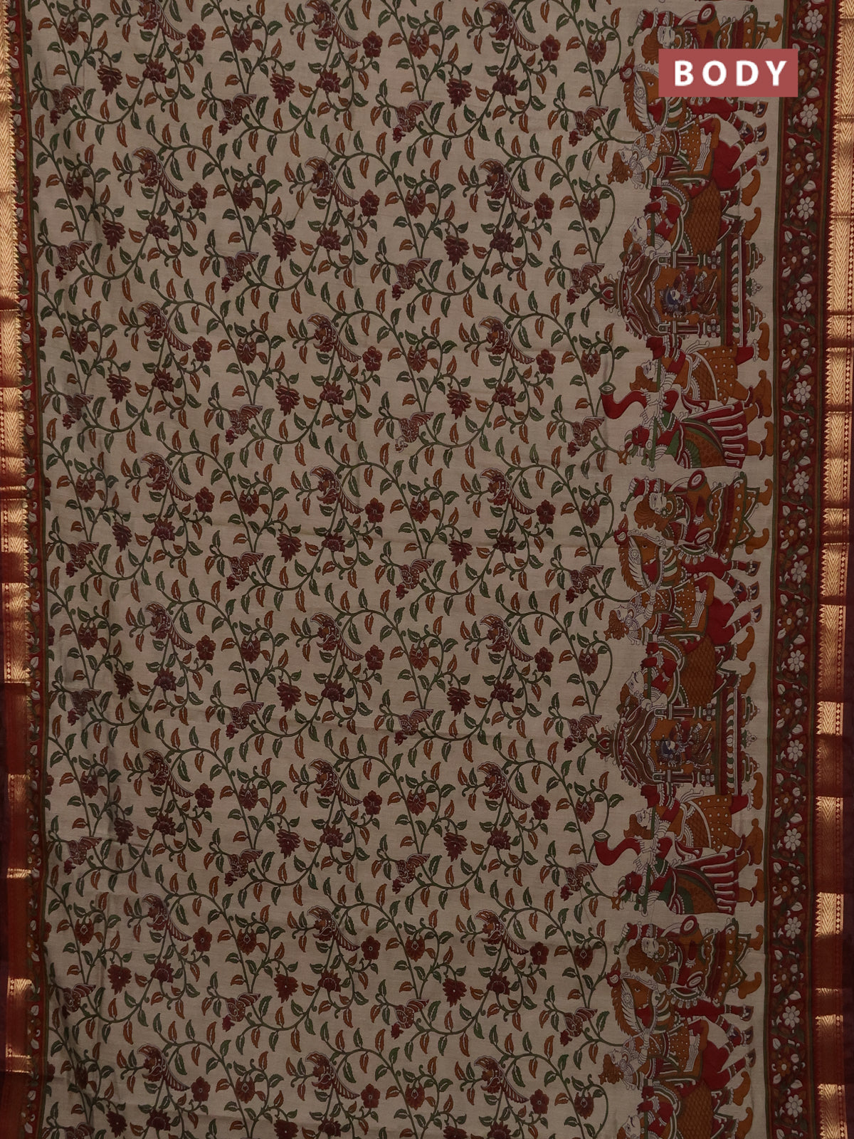 Maheshwari cotton saree beige and maroon with kalamkari prints and zari woven border