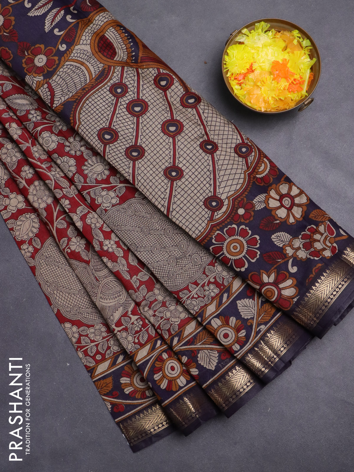 Maheshwari cotton saree maroon and navy blue with allover flower prints and zari woven border