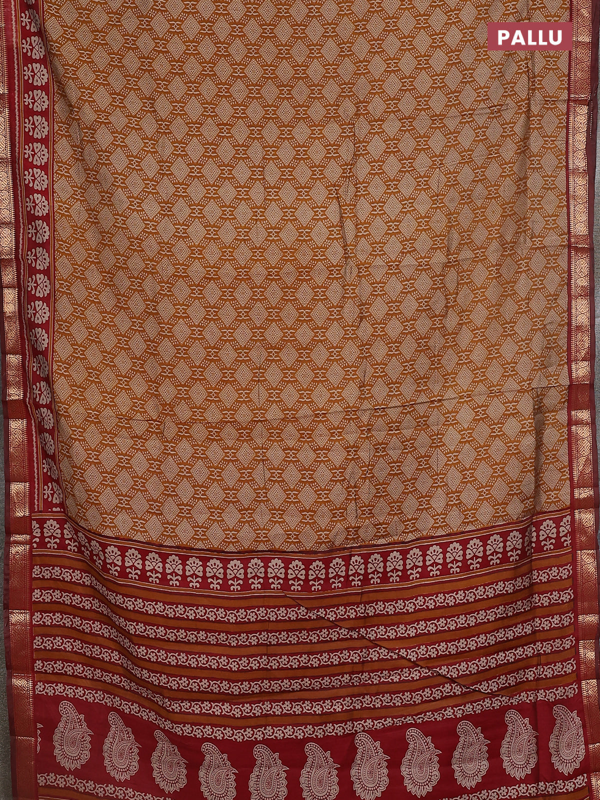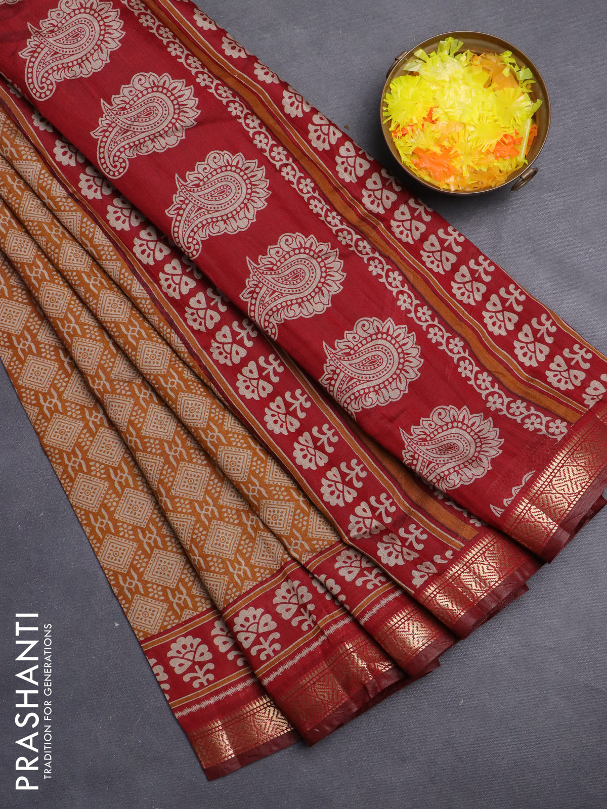 Maheshwari cotton saree mustard yellow and maroon with allover prints and zari woven border