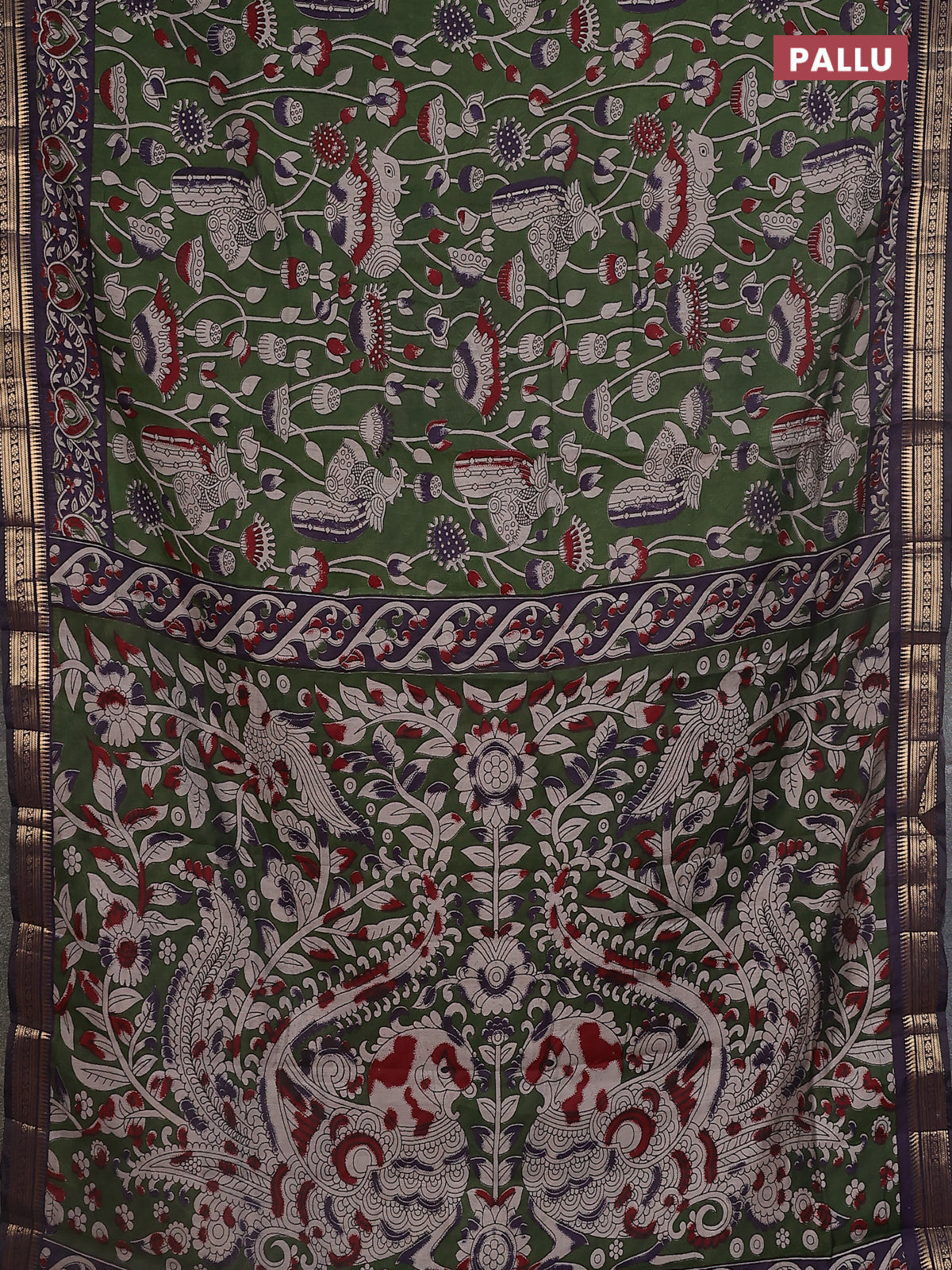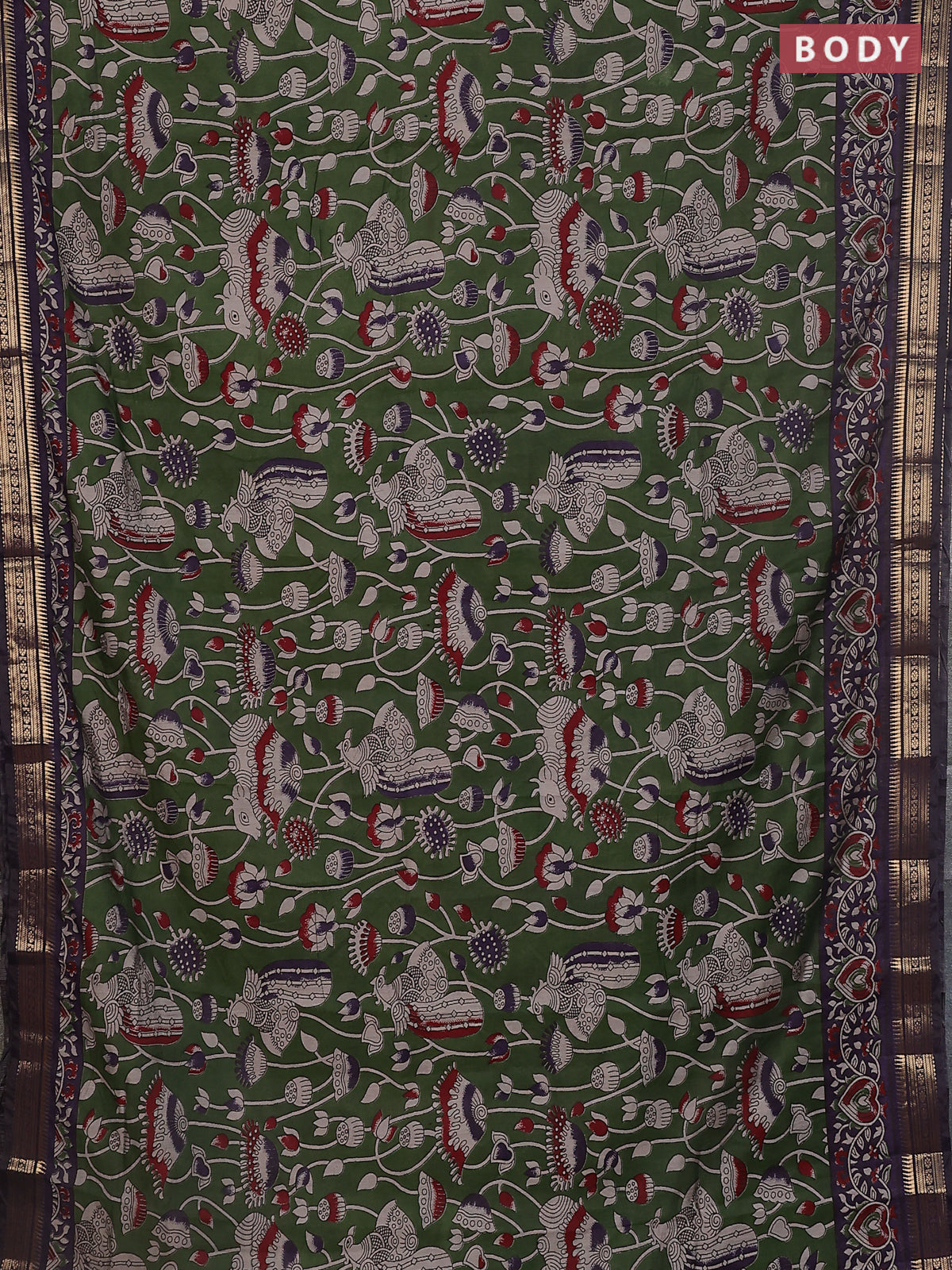 Maheshwari cotton saree sap green and violet with kalamkari prints and zari woven border
