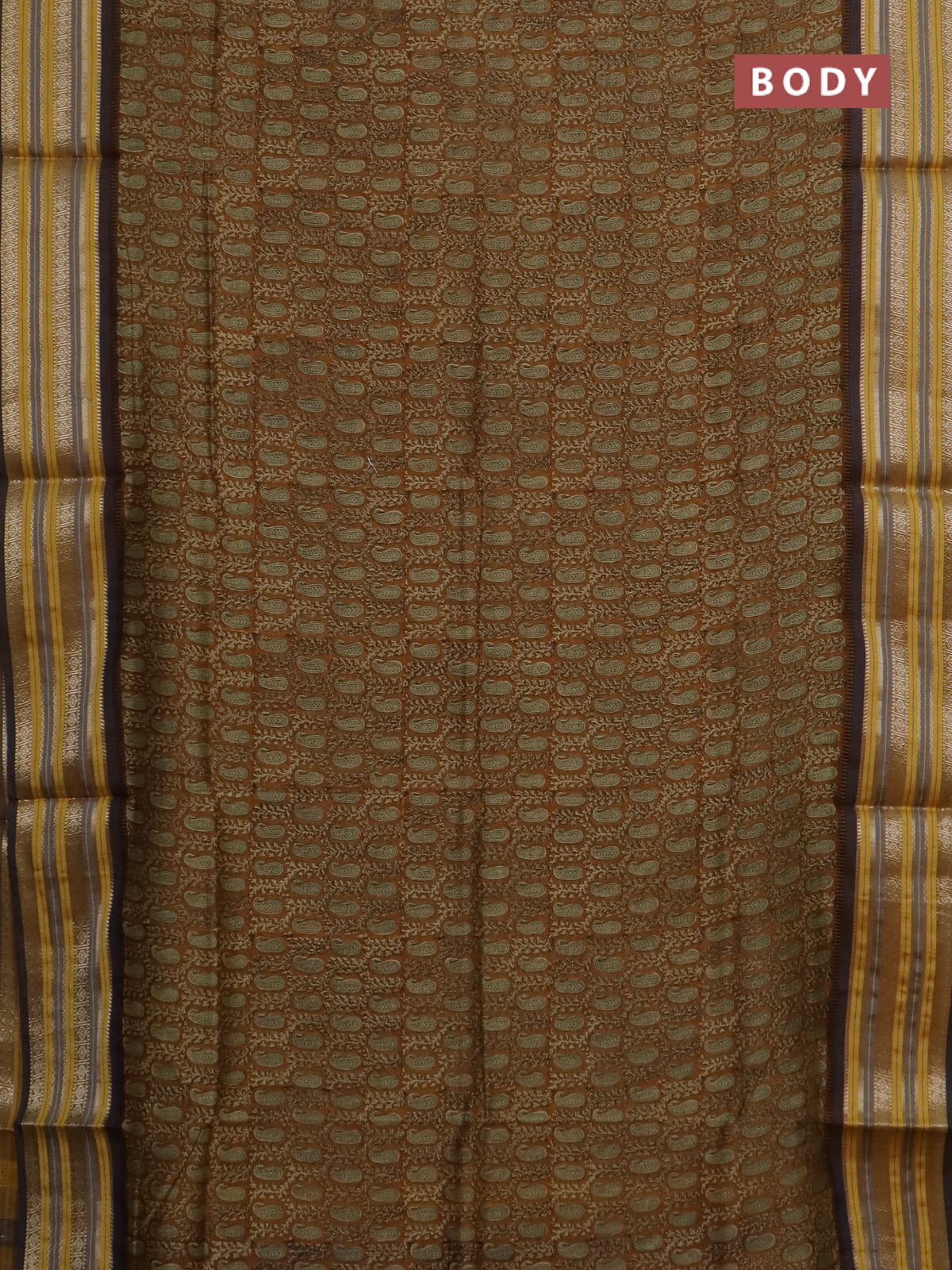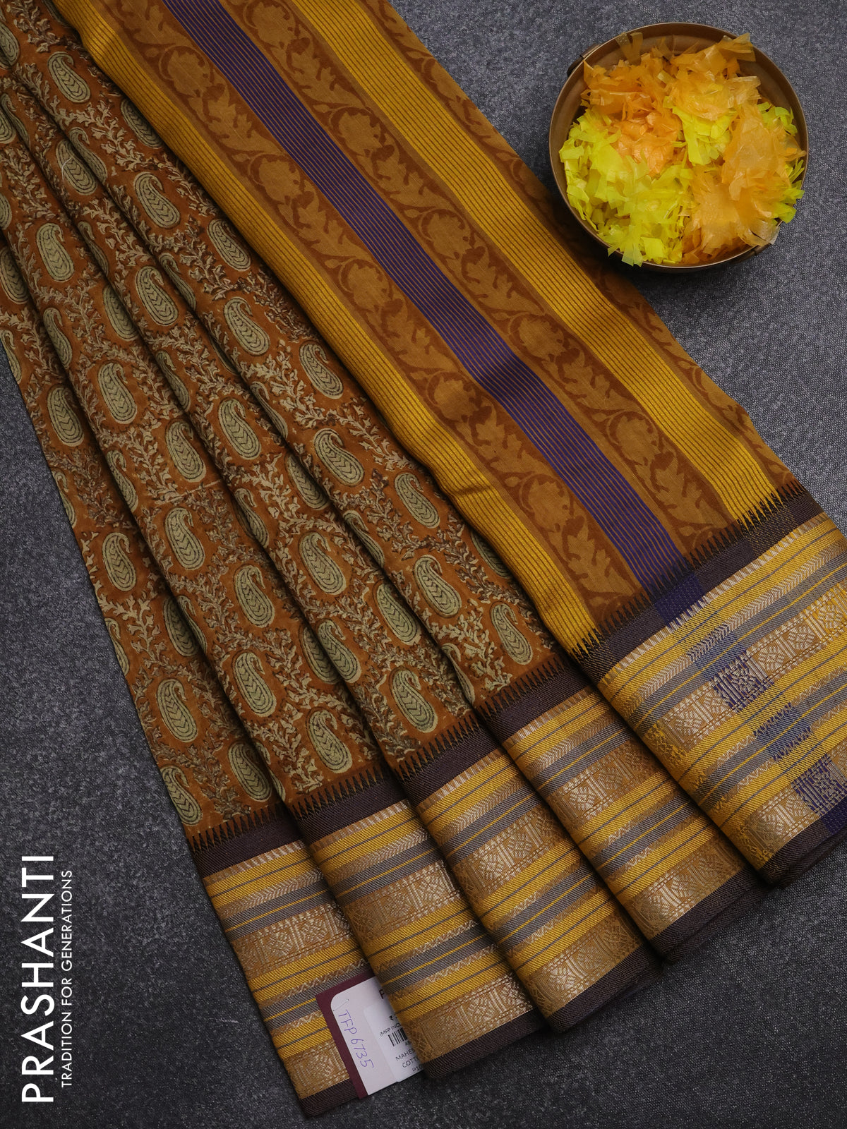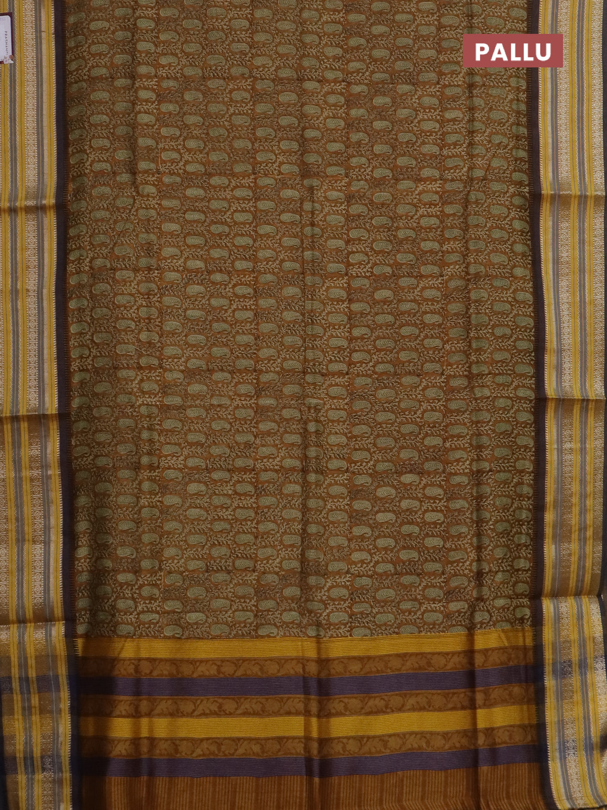 Maheshwari silk cotton saree dark mustard and multi colour with allover paisley prints and thread & silver zari woven border