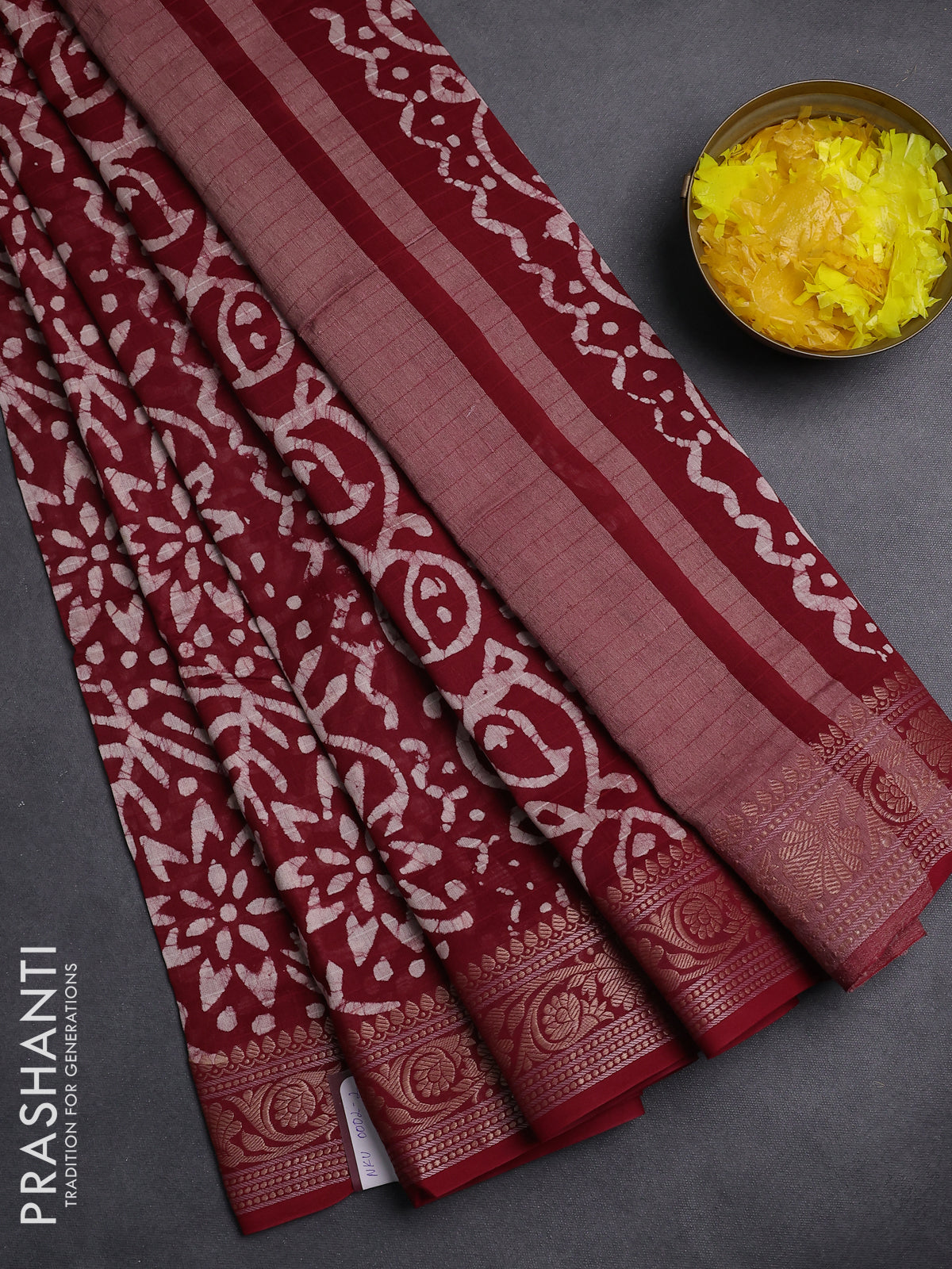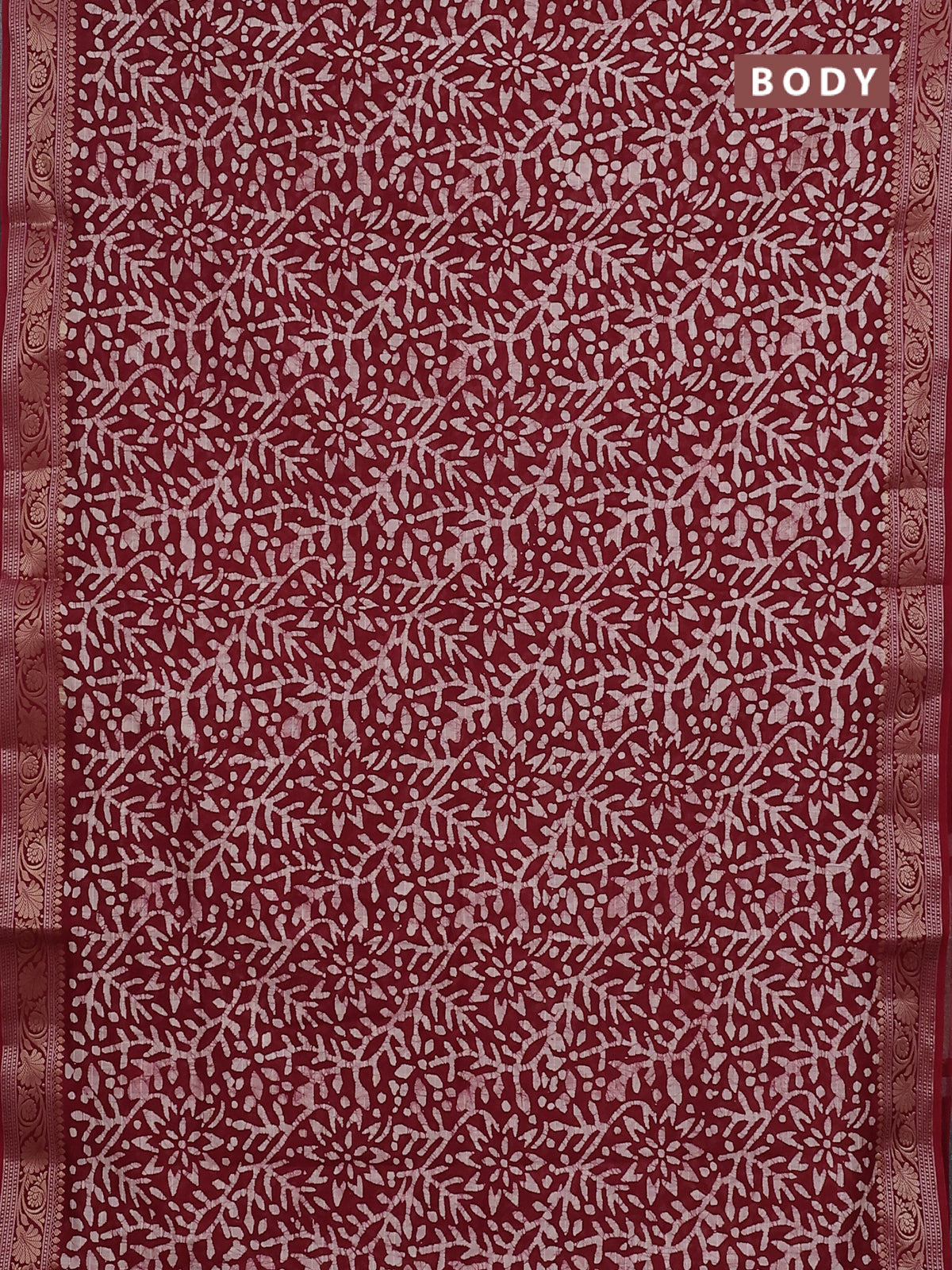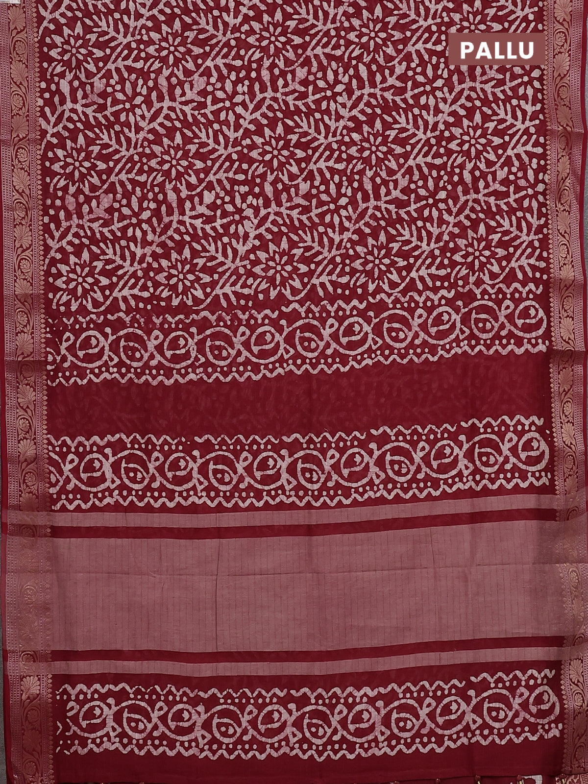 Maheshwari silk cotton saree maroon with allover batik prints and zari woven border