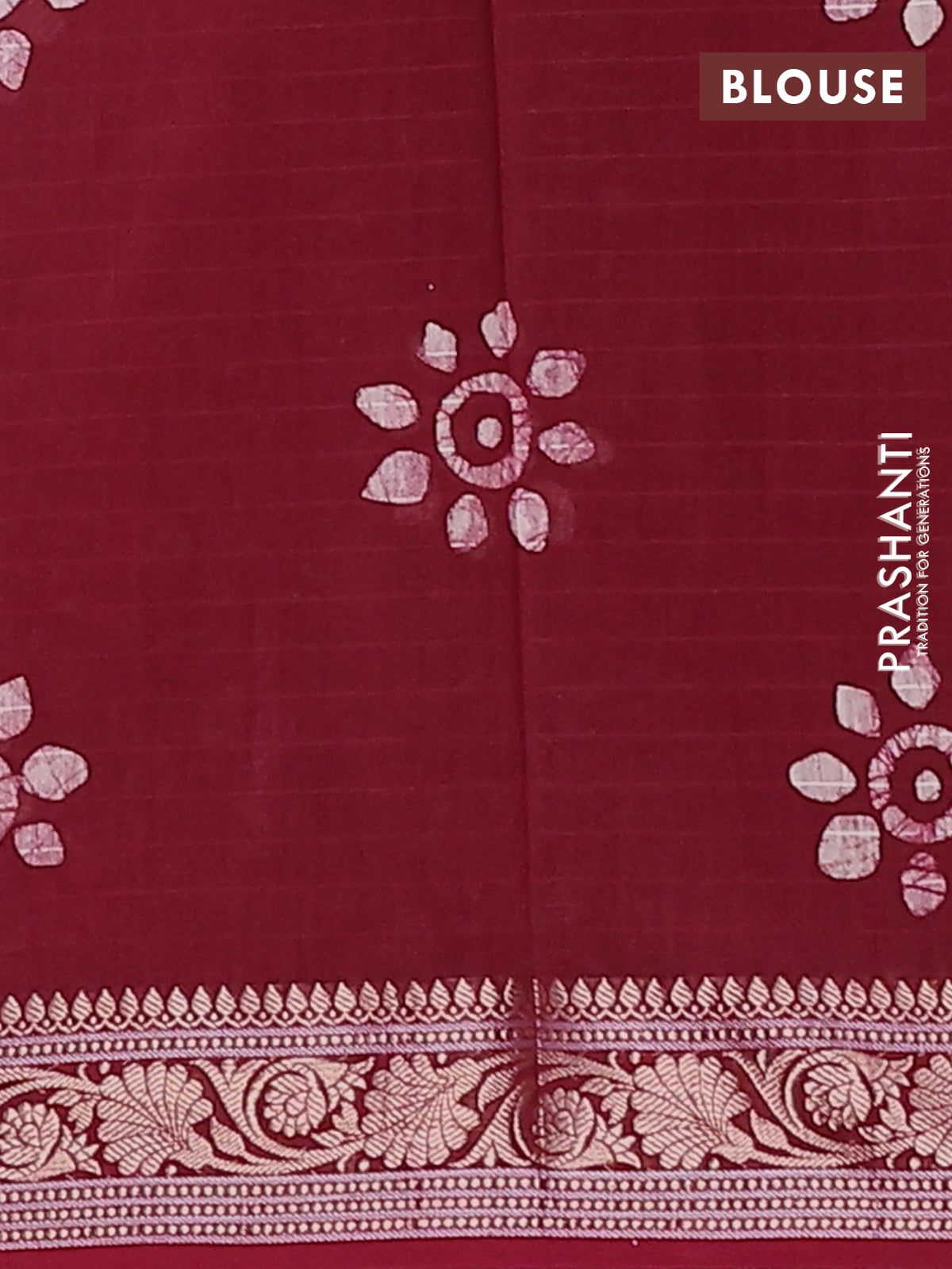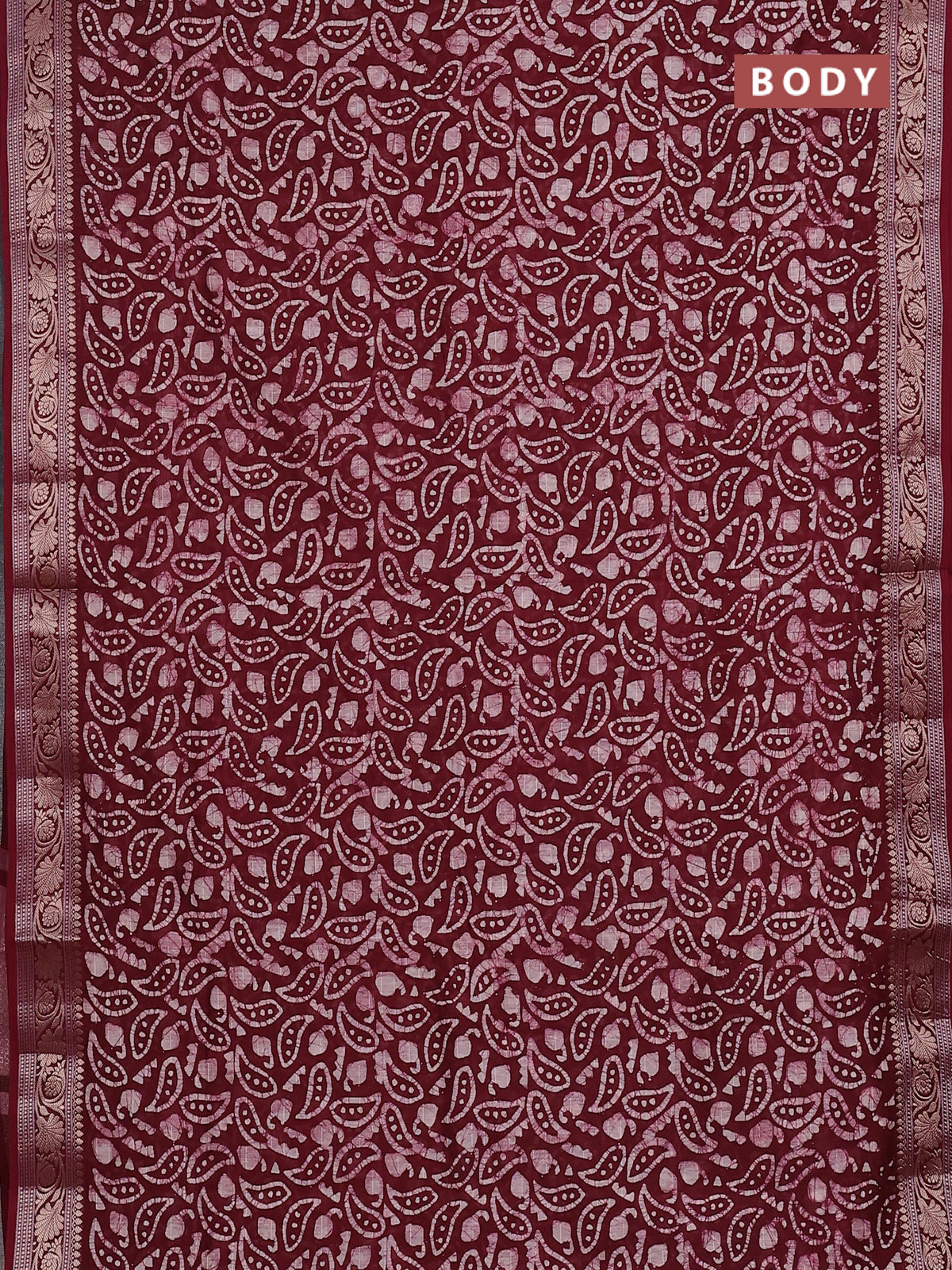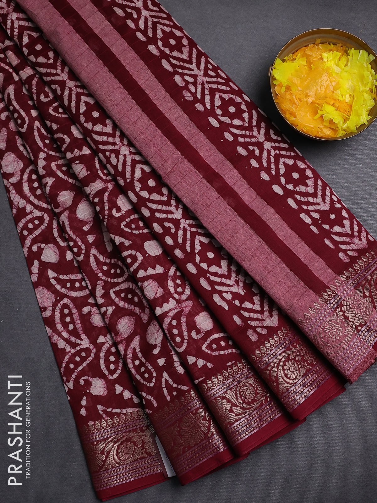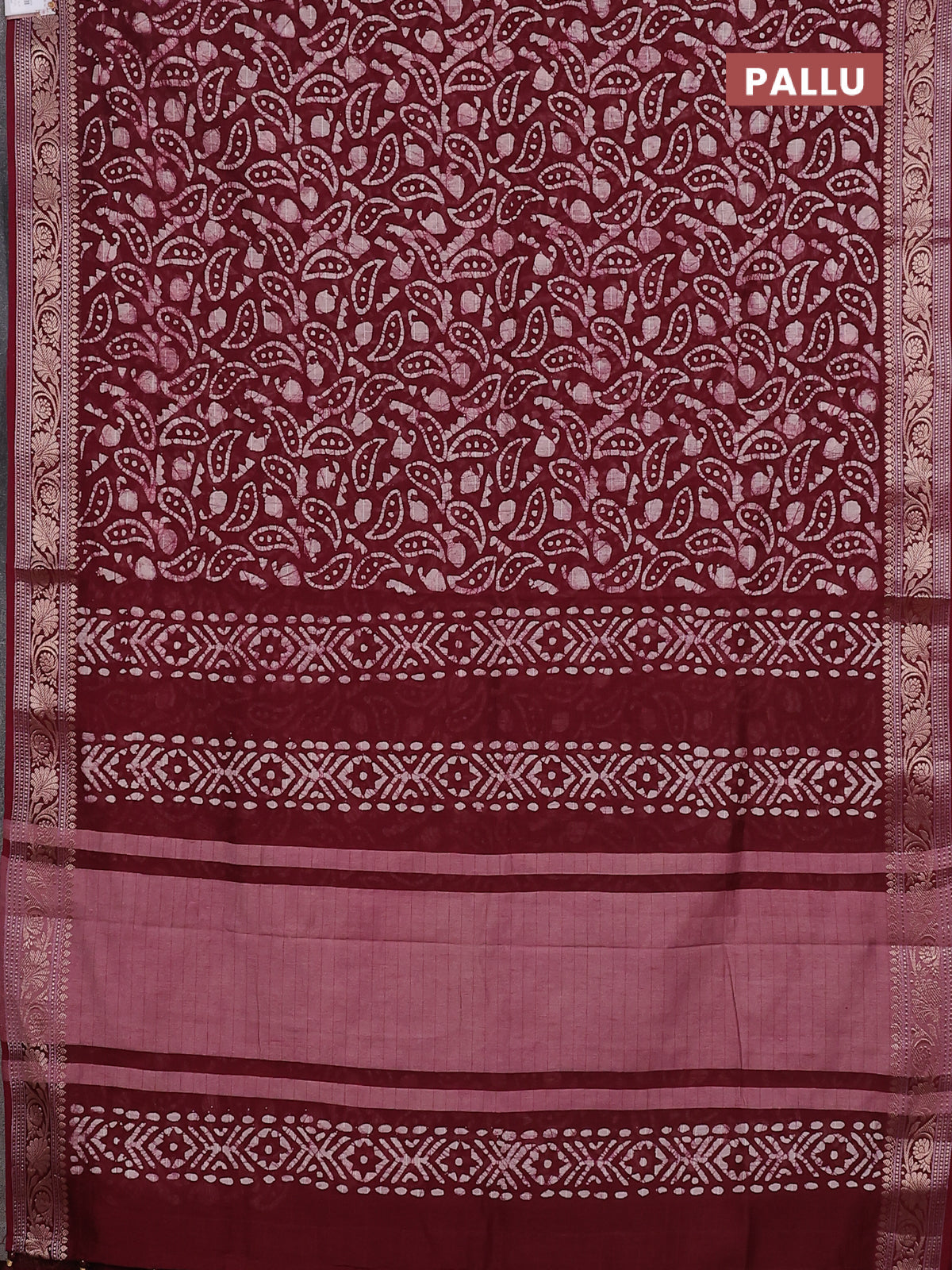 Maheshwari silk cotton saree maroon with allover batik prints and zari woven border