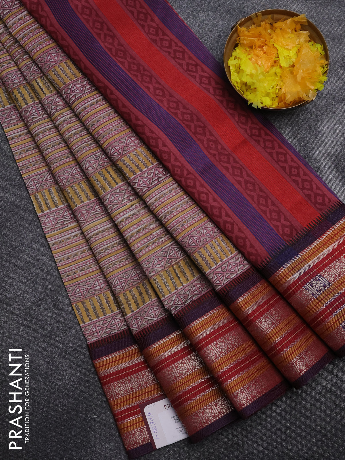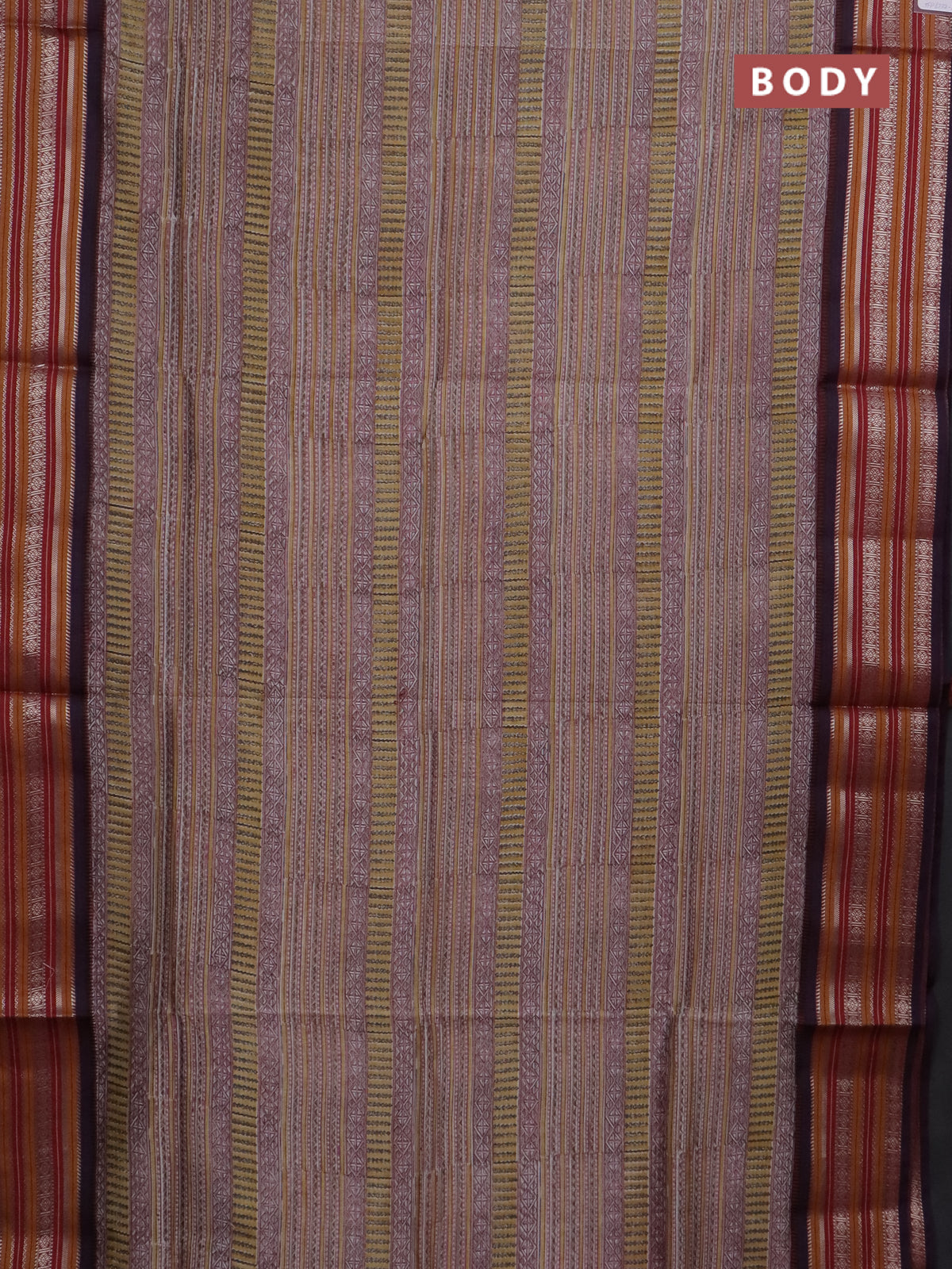 Maheshwari silk cotton saree yellow grey and maroon shade with allover kalamkari prints and thread & silver zari woven border