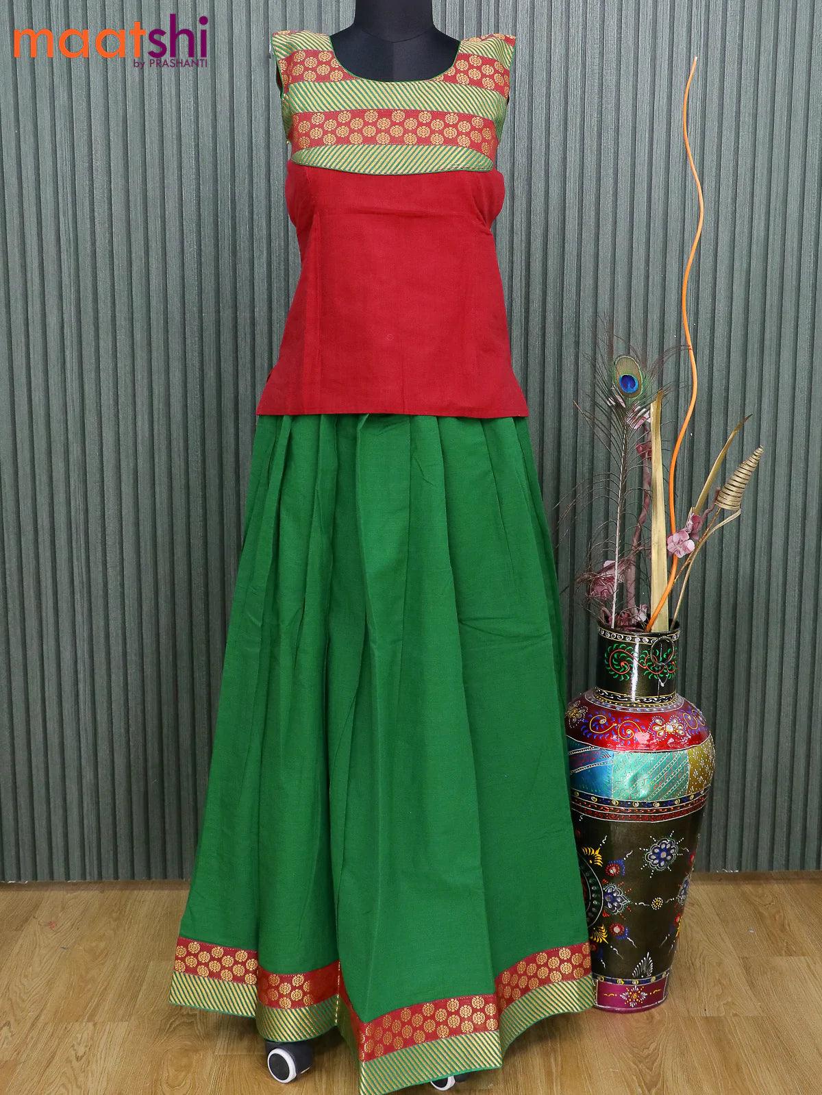 Mangalagiri cotton kids lehanga maroon and green with patch work neck pattern and zari woven border for 15 years - sleeve attached