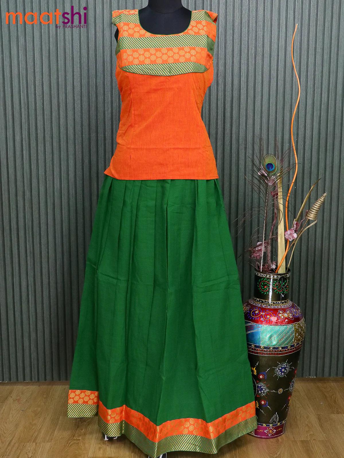 Mangalagiri cotton kids lehanga sunset orange and green with patch work neck pattern and zari woven border for 16 years - sleeve attached