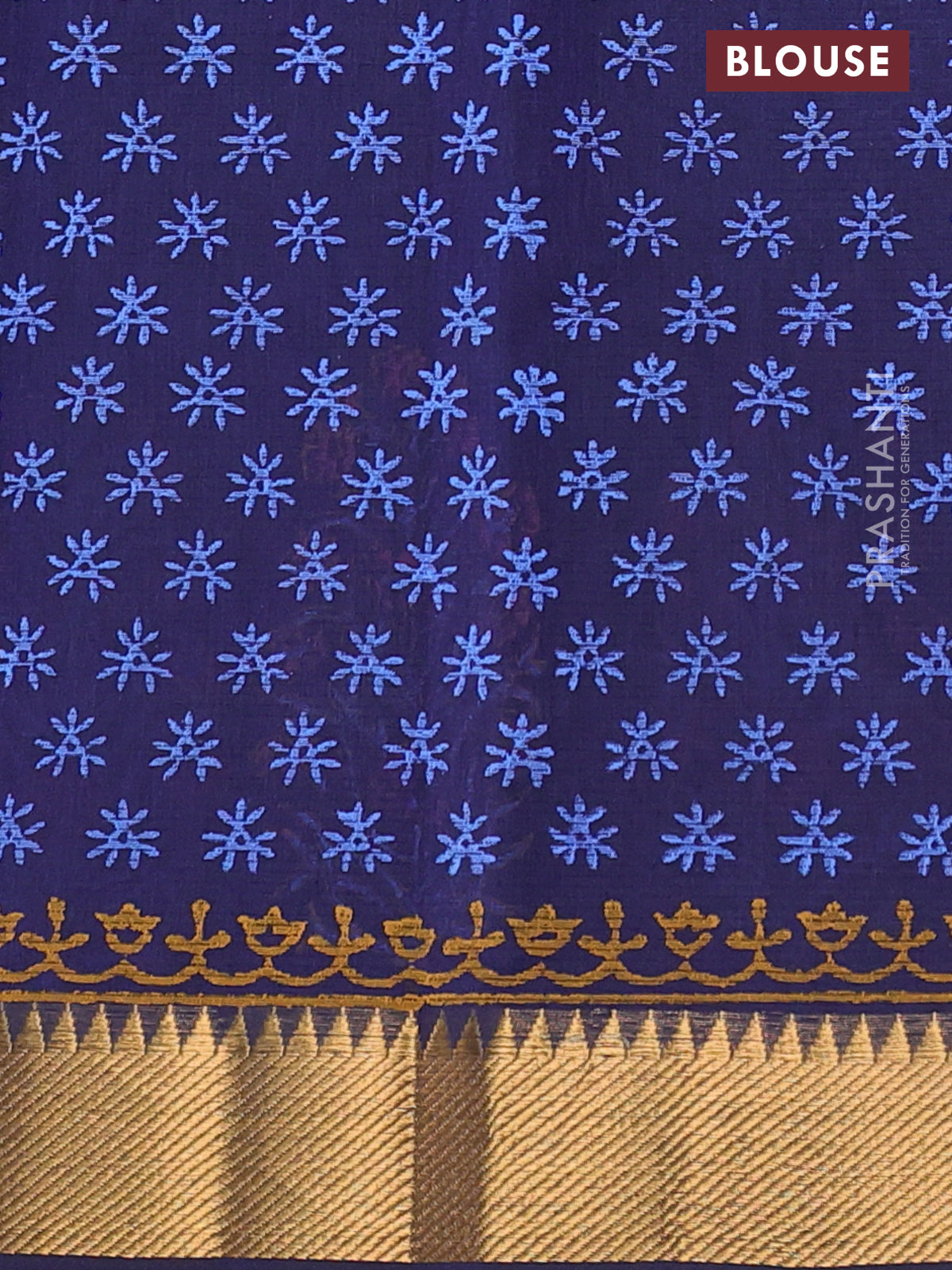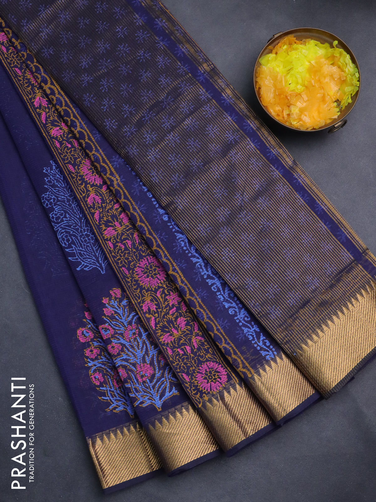 Mangalgiri cotton block printed saree dark blue with floral butta prints and zari woven border