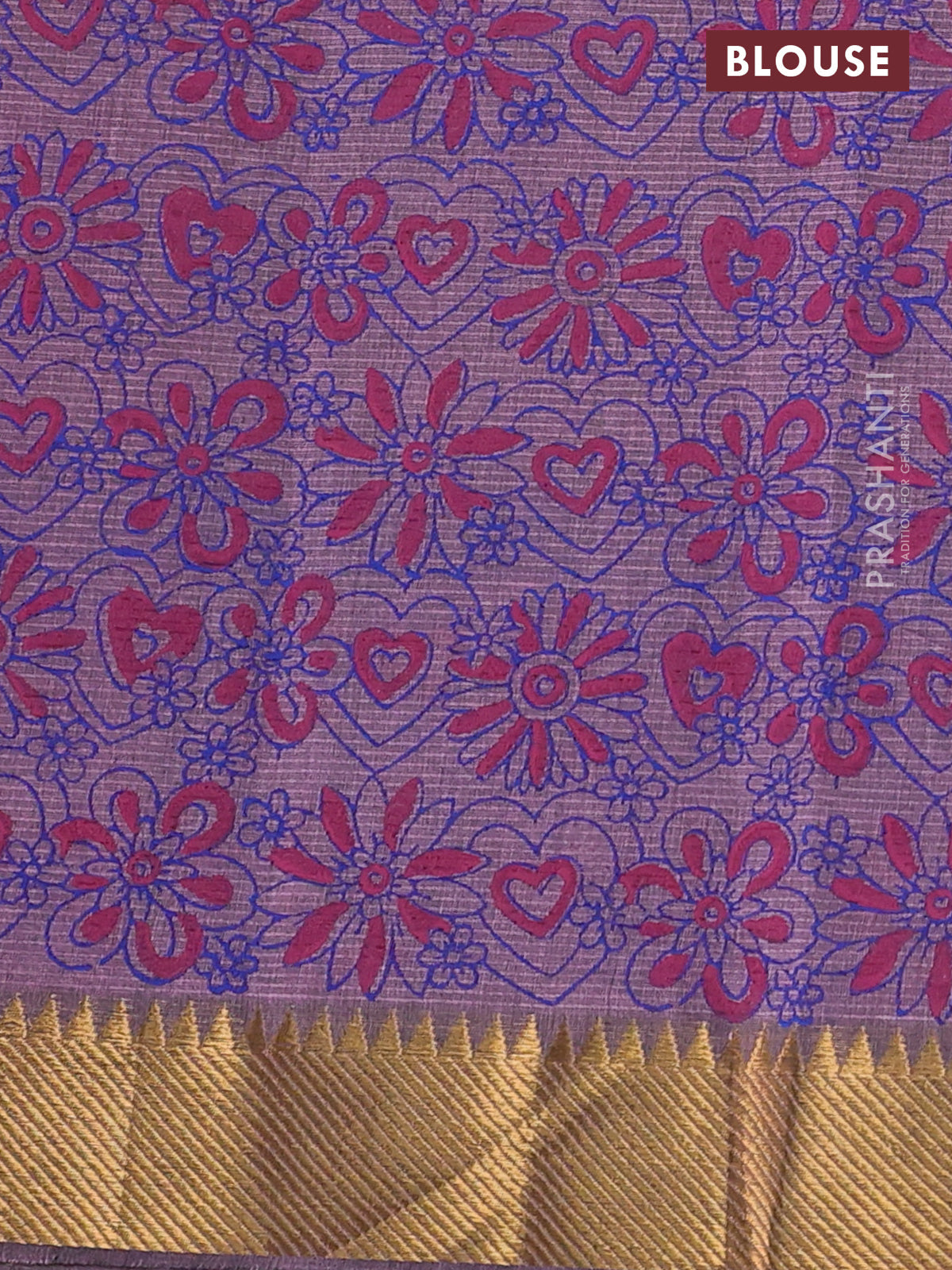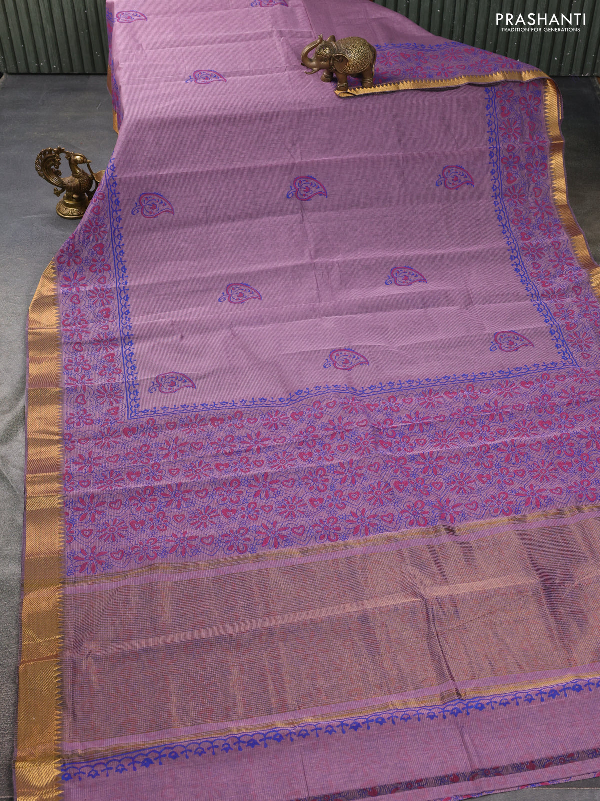 Mangalgiri cotton block printed saree pastel purple with leaf butta prints and zari woven border