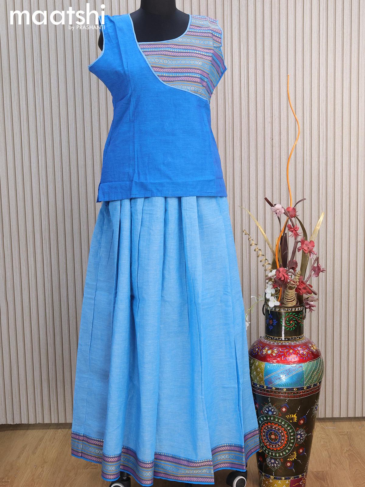 Mangalgiri cotton kids lehenga cs blue and light blue with patch work neck pattern and woven border for 16 years