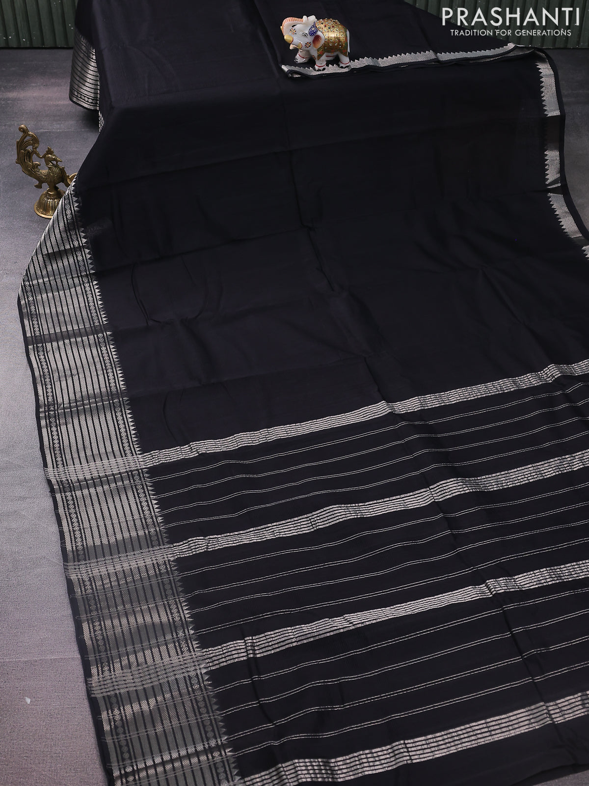 Mangalgiri silk cotton saree black and green shade with plain body and silver zari woven border