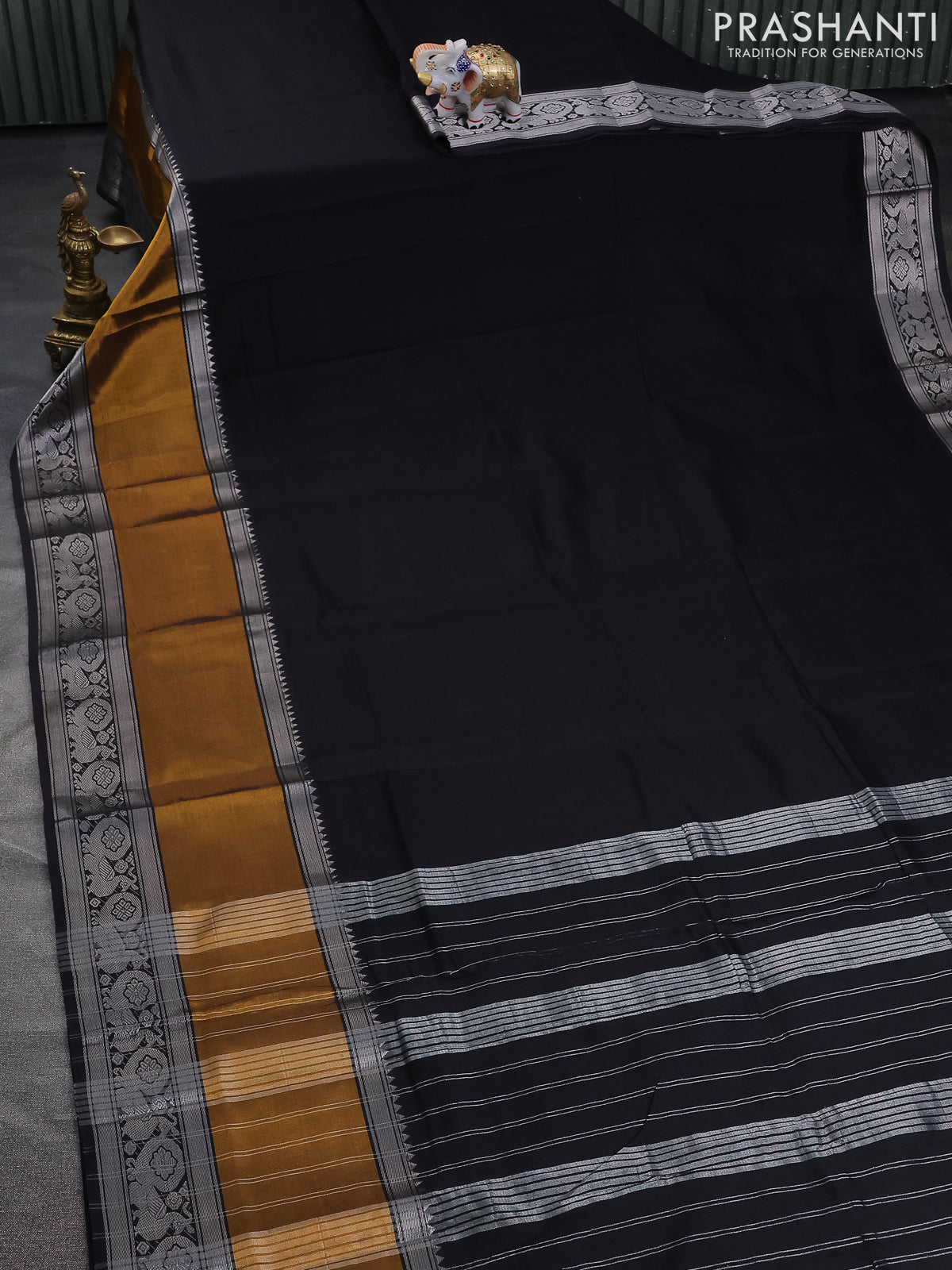 Mangalgiri silk cotton saree black and green with plain body and long rettapet silver zari woven border