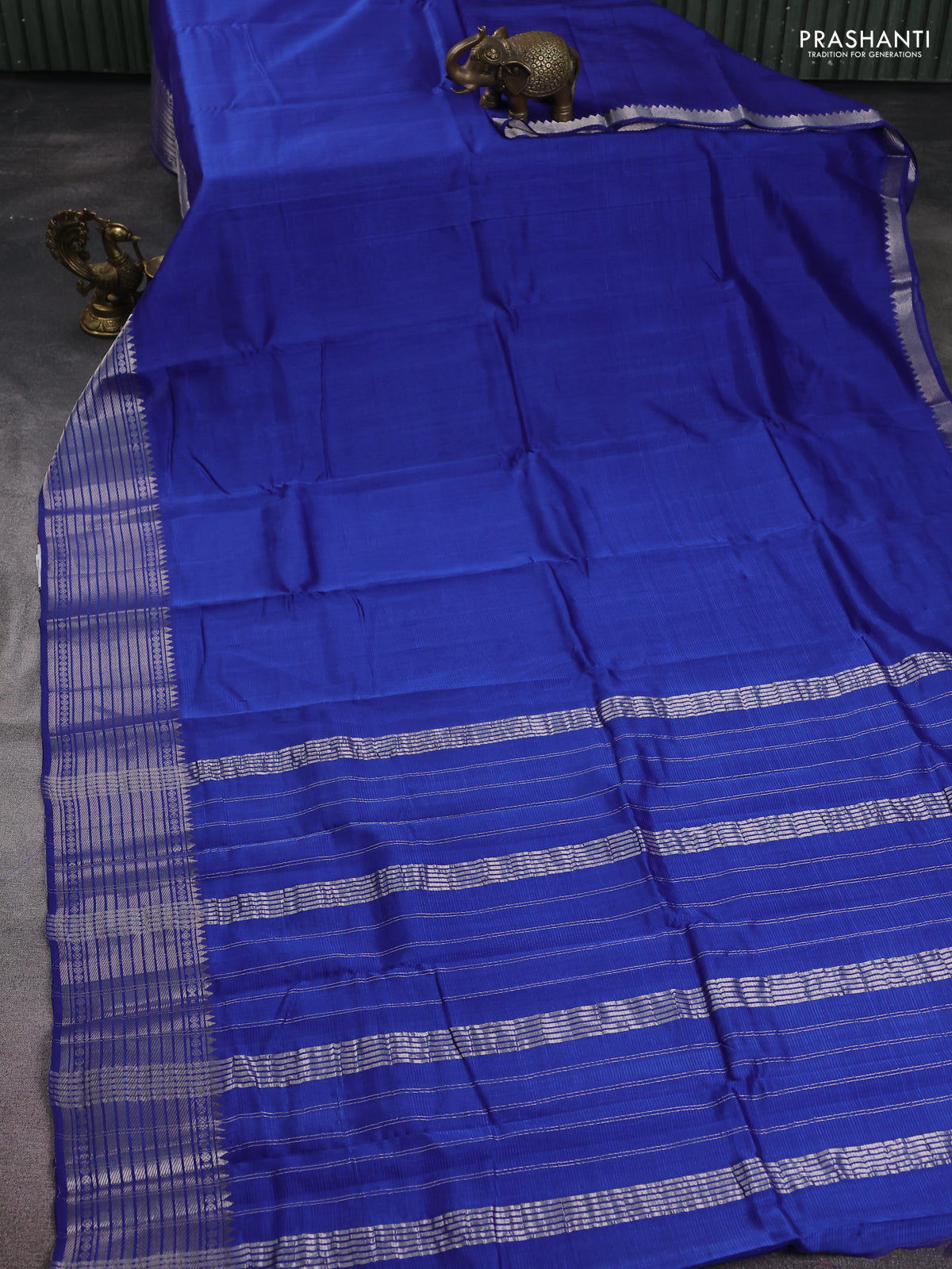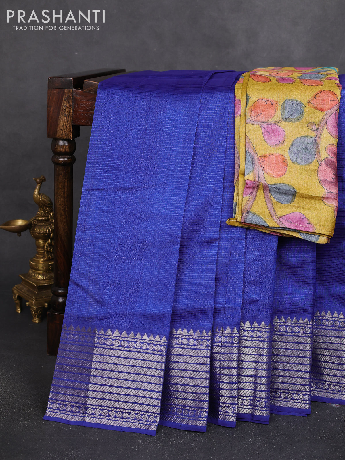 Mangalgiri silk cotton saree blue and mustard yellow with plain body and silver zari woven border