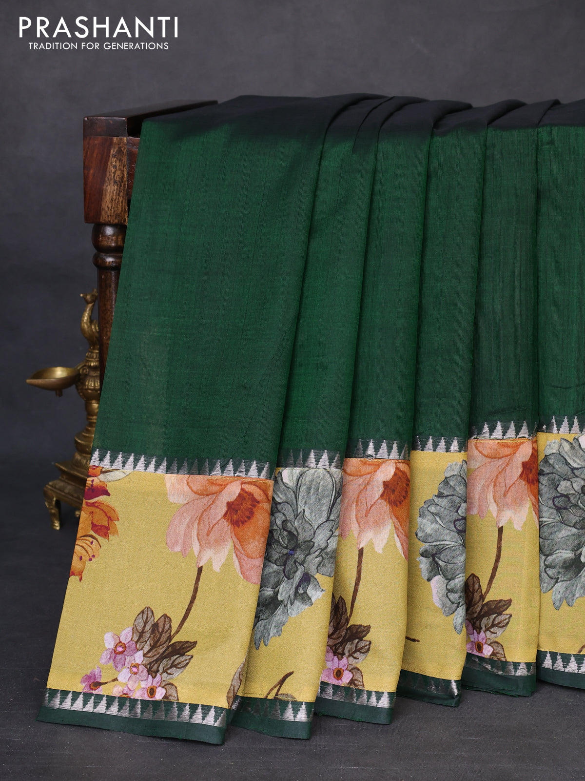 Mangalgiri silk cotton saree dark green and yellow with plain body and temple design kalamkari printed applique border
